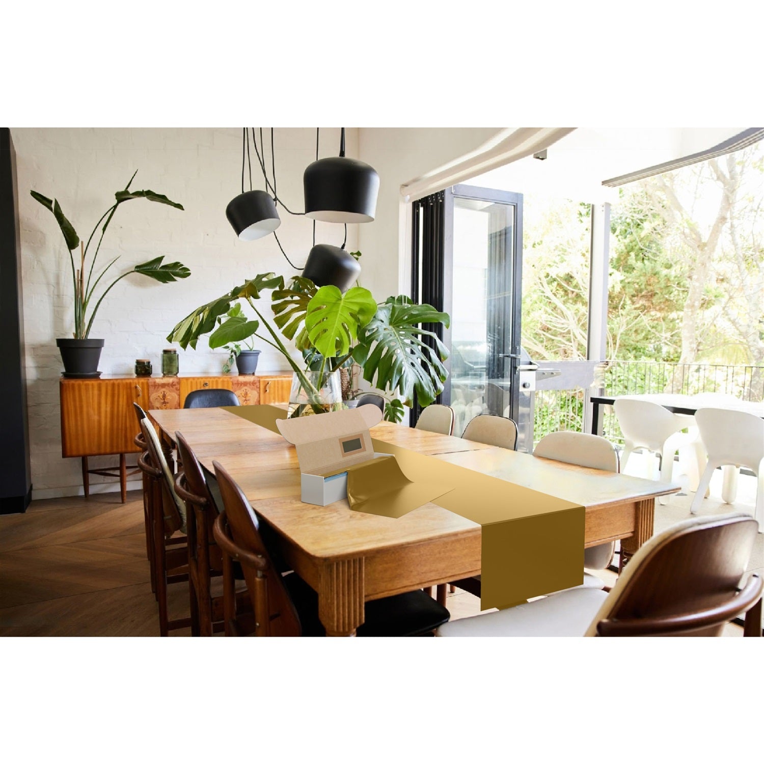 Transform your tables with our premium gold table runner - 14 inches wide and 200 feet long. Cut to your perfect length for customized event setups.