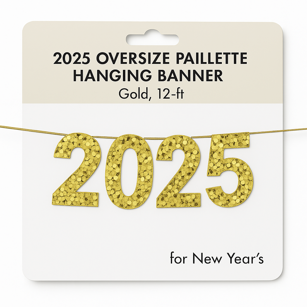 Ring in the New Year with glamour with this 2025 Gold Paillette Oversized Banner. Spanning 12 feet, this striking decoration makes a bold statement with its shimmering gold paillette design. The oversized numbers, standing 15 inches tall, are crafted from quality cardboard and paillette fabric, suspended on a sturdy rope. Perfect for adding an elegant touch to your New Year's Eve festivities, this banner is a must-have for welcoming 2025 in style. Ideal for parties, events, and seasonal decorations.