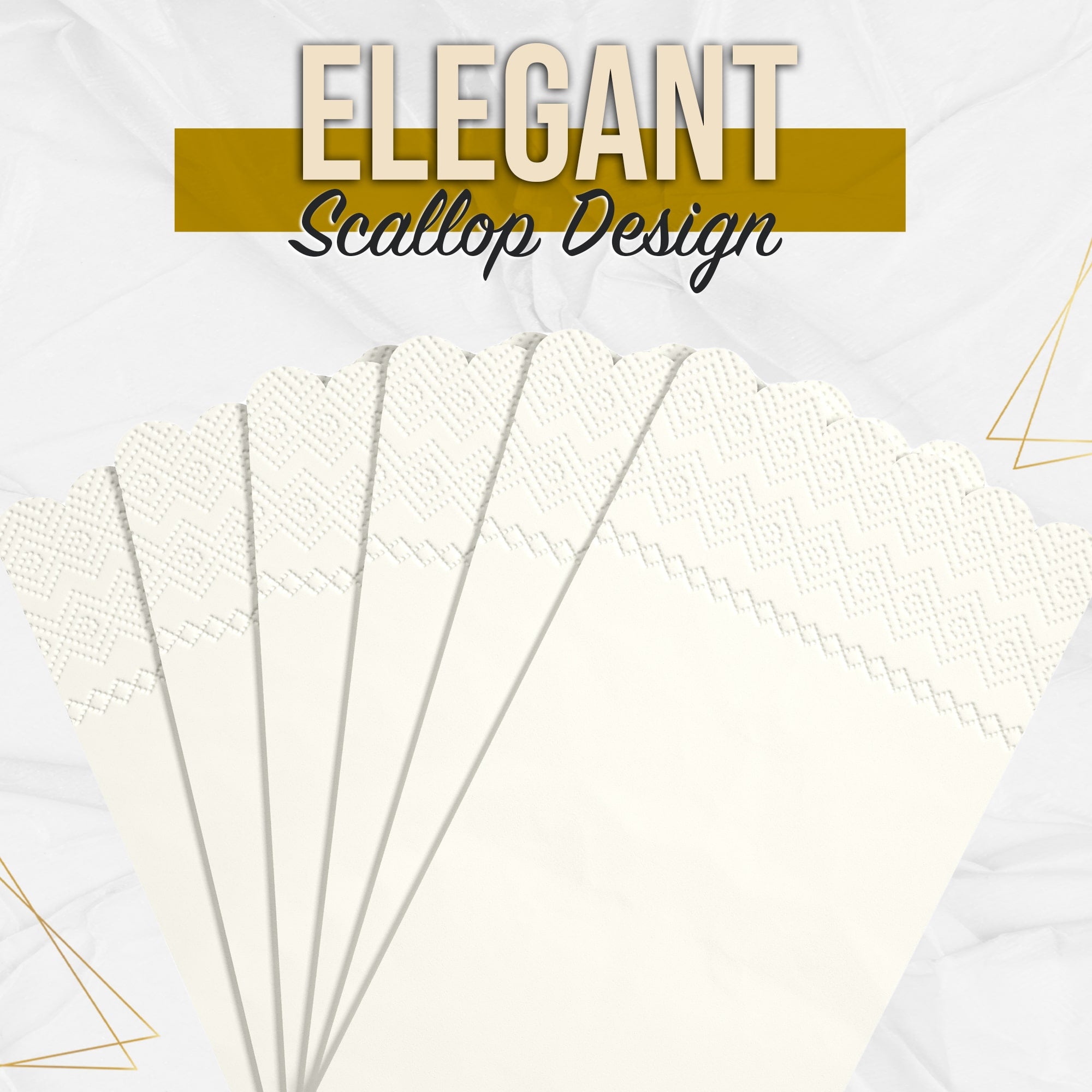 Elevate your table setting with these 3 Ply Ivory Scalloped Napkins. Crafted for durability and softness, their elegant scalloped edges add a refined touch to any occasion. Perfect for parties, weddings, or everyday use, this 20-count pack ensures you have plenty on hand to impress your guests with both style and practicality.