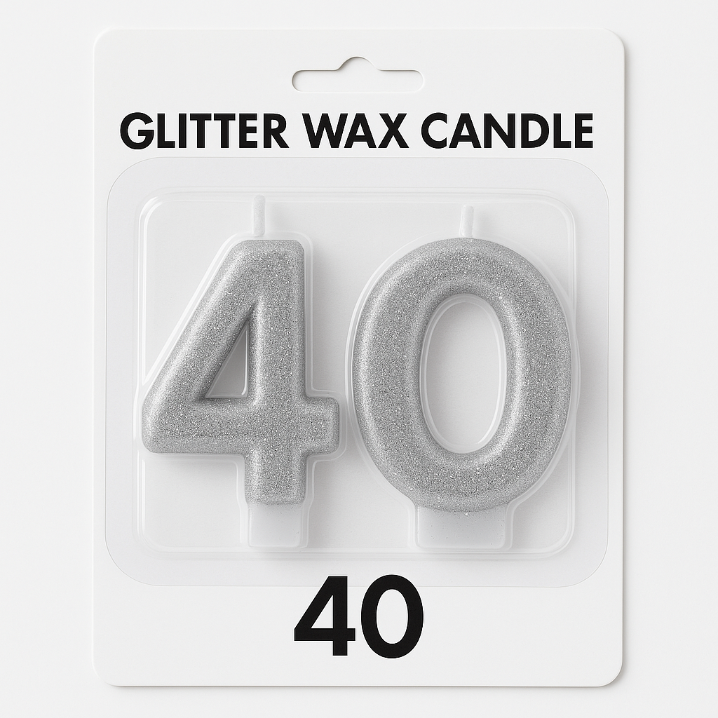 Celebrate the milestone 40th birthday in stunning style with these dazzling silver glitter number candles. Molded into the numbers 4 and 0, each candle measures 1 3/4 inches wide by 3 inches long, creating a perfect shimmering centerpiece for your celebration. Whether it's a birthday or an anniversary, let these sparkling candles add a touch of glamor to your special occasion.