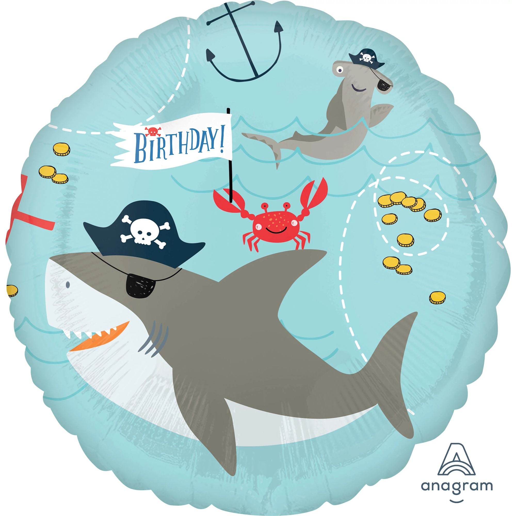 Dive into fun with our Ahoy Pirate Shark Mylar Balloon! This 18-inch foil balloon features a playful pirate shark, adventure-seeking crab, and ocean waves, setting the perfect scene for a swashbuckling 1st birthday celebration. Ideal for everyday occasions, this metallic balloon adds a splash of whimsy and excitement to your party decor. Make your little one's birthday unforgettable with this charming nautical theme!