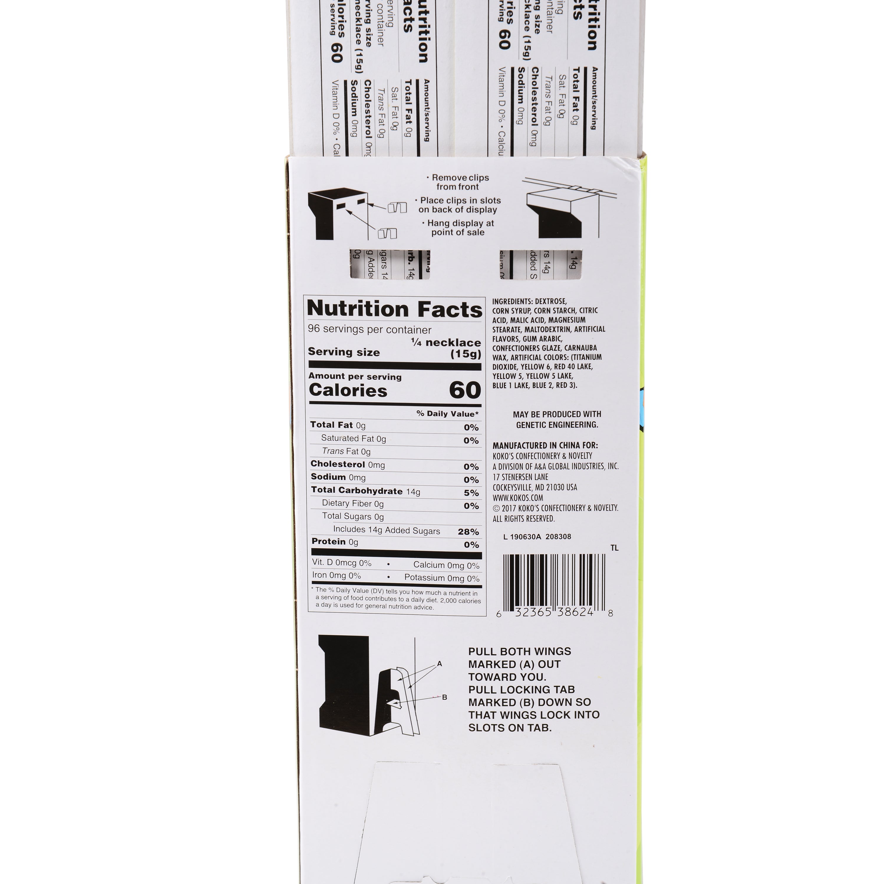The World's biggest candy necklace is a sweet and sour treat for any occasion. Wear and eat this mouth puckering treat. 15" L. , 2.1 oz per necklace. 24 pieces of candy per unit.