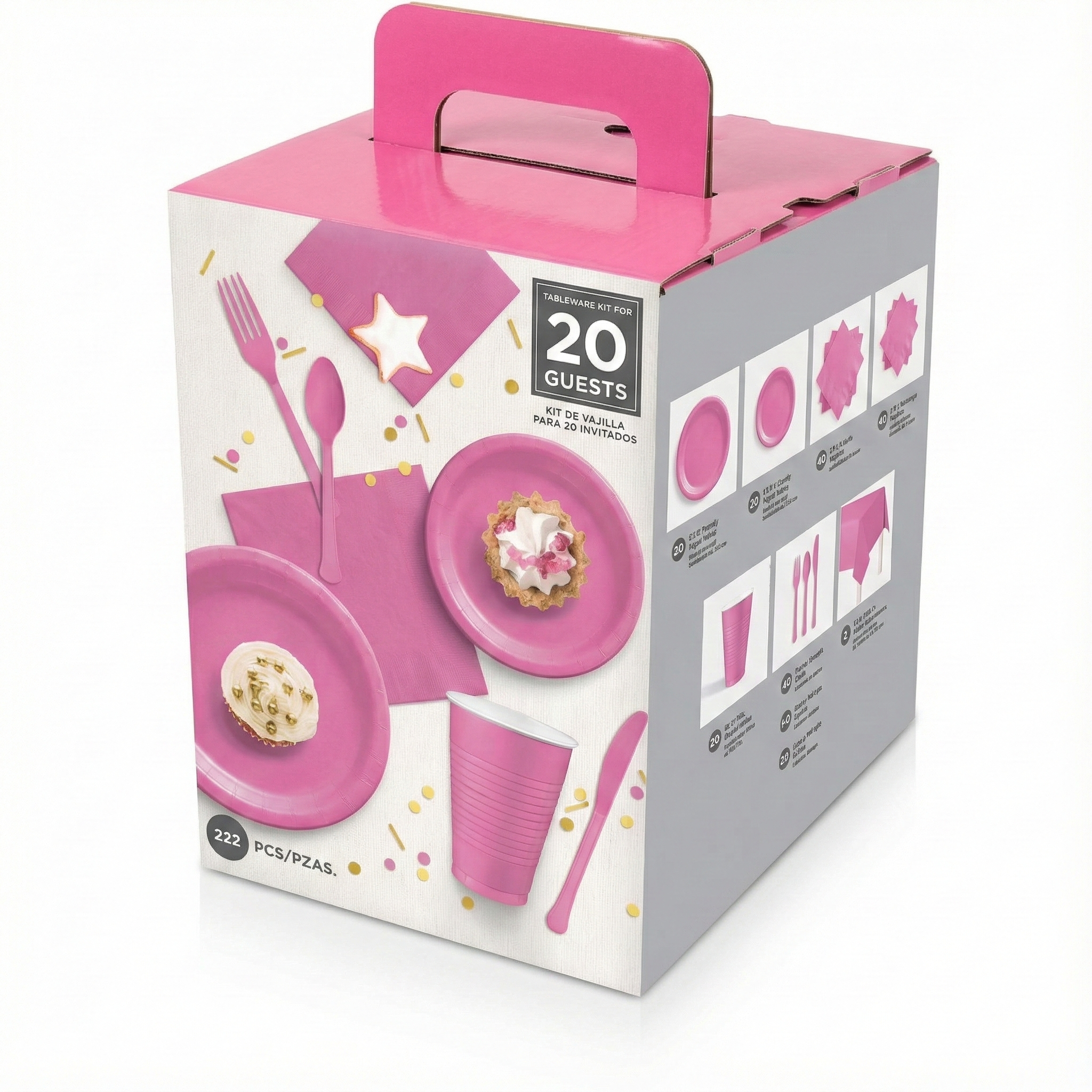 Add a vibrant touch to any event with our Bright Pink Tableware Kit. Perfect for parties, gatherings, or everyday use, this kit includes 20 matching pieces that bring bold color and convenience to your table settings. Ideal for solid color themes, this boxed kit ensures effortless coordination and style, making your party planning a breeze. Enjoy easy clean-up and a splash of brightness with every meal.