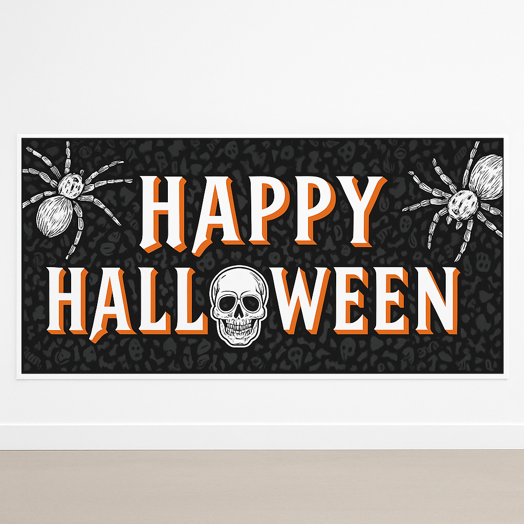 Transform your space into a spine-chilling retreat with our Classic Halloween Scene Setter Banner. Featuring bold "Happy Halloween" lettering accompanied by eerie spiders and a skull, this horizontal banner sets a haunting tone. Perfect for both indoor and outdoor use, it’s a bewitching addition to your Halloween décor. Hang it up and let the festivities begin!