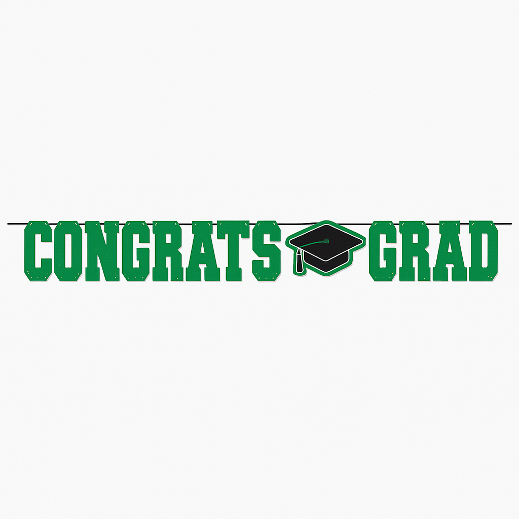Celebrate the achievements of your graduate in style with the "Congrats Grad" Letter Banner. This vibrant green cardstock banner spells out your pride with bold block letters and a charming graduation cap centerpiece. Perfect for both high school and college graduations, this 12-foot banner is an ideal addition to your party decor. Hang it on walls to enhance your celebration and showcase your school colors with flair. Easy to display with included hanging string, it’s a great way to make your graduate feel extra special!