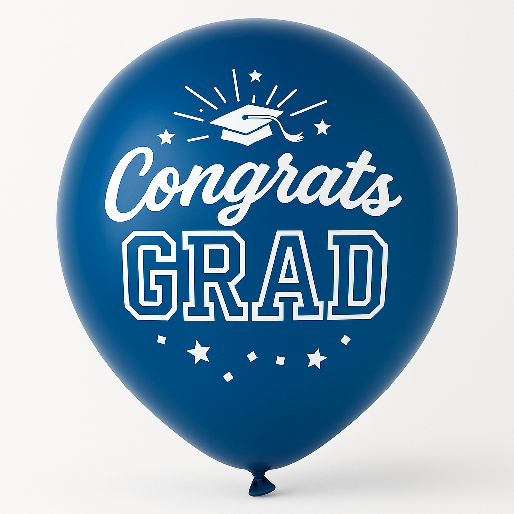 Celebrate your graduate in style with our "Congrats Grad" Blue Latex Balloons. Perfectly themed for graduation parties, these 12-inch balloons add a vibrant touch to your décor. Crafted from durable latex, they can be filled with helium to elevate the celebration. Whether matching your school colors or creating a festive ambiance, these balloons set the perfect mood for this special milestone. Please supervise children around deflated or burst balloons to prevent choking hazards.