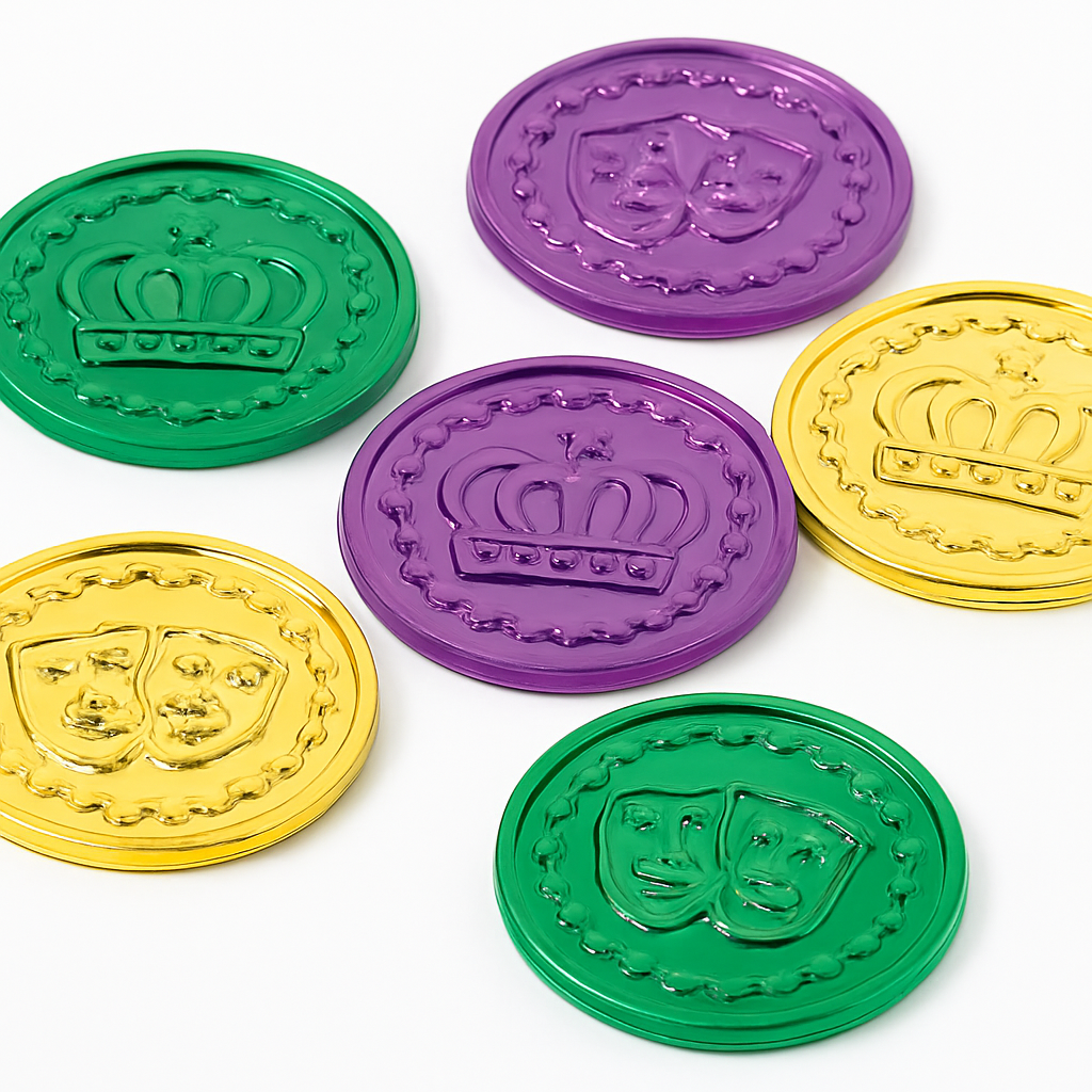 Celebrate in style with these vibrant Mardi Gras Crown Coins! Ideal for your Fat Tuesday festivities, each coin is double-sided with a crown and masks design, reflecting the lively spirit of the season. Perfect for parade throws, table decorations, or party favors, these plastic coins come in the traditional Mardi Gras colors of gold, green, and purple. With 100 coins per pack, you’ll have plenty to share the festive fun. Suitable for adult use only, each coin measures 1 3/8" in diameter. Let the good times roll!