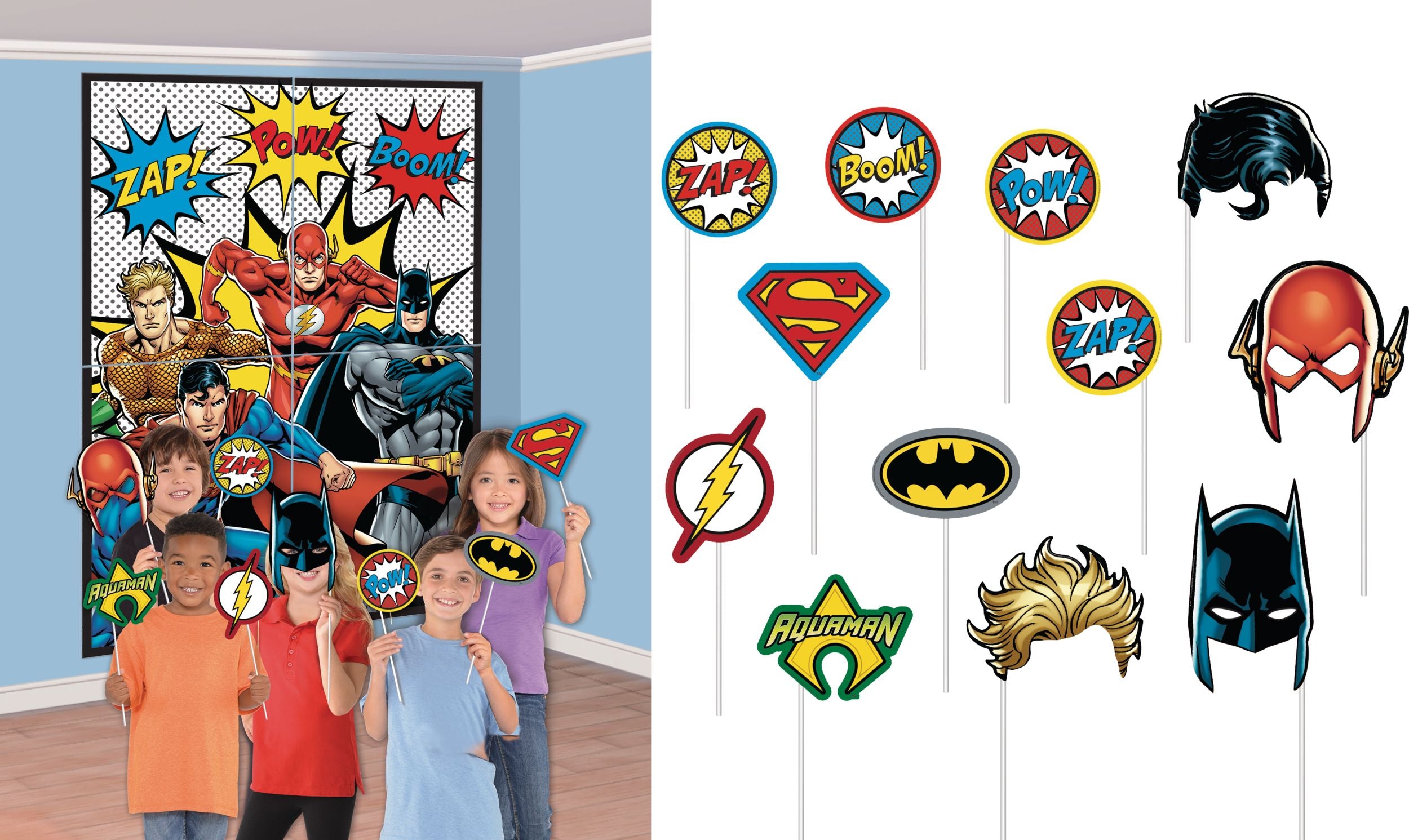 Transform your child's birthday into a superhero spectacle with the DC Justice League "Zap Pow Boom" Scene Setter! Featuring a vibrant, four-piece backdrop of Aquaman, Superman, The Flash, and Batman springing into action, it's perfect for photo ops. Kids will love posing with the 12 fun, cardstock props, including superhero masks and comic book icons. Measuring 59" x 65", this 16-piece set creates an immersive party experience that's sure to be a hit at any Justice League-themed celebration!