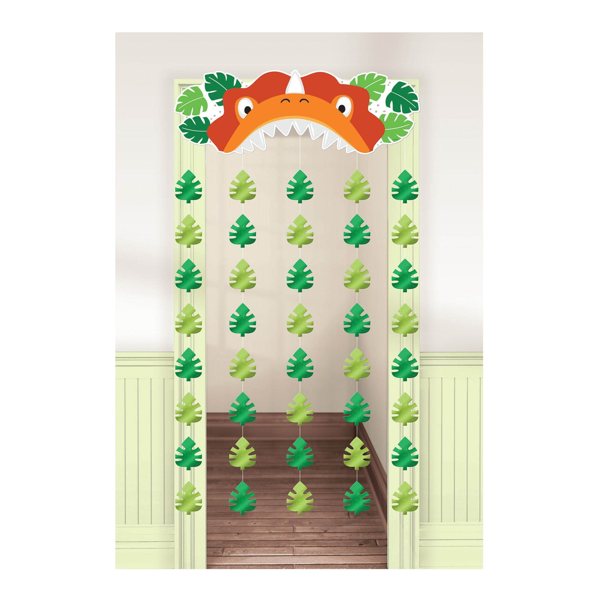 Transform your celebration into a prehistoric paradise with the Dino-Mite Doorway Curtain. Perfect for your baby's first birthday, this playful decoration features a friendly Triceratops face and cascading strands of vibrant green leaves. Measuring 39" x 77", it's ideal for doorways or as a fun photo backdrop. Welcome your little ones to a dino adventure they'll never forget!