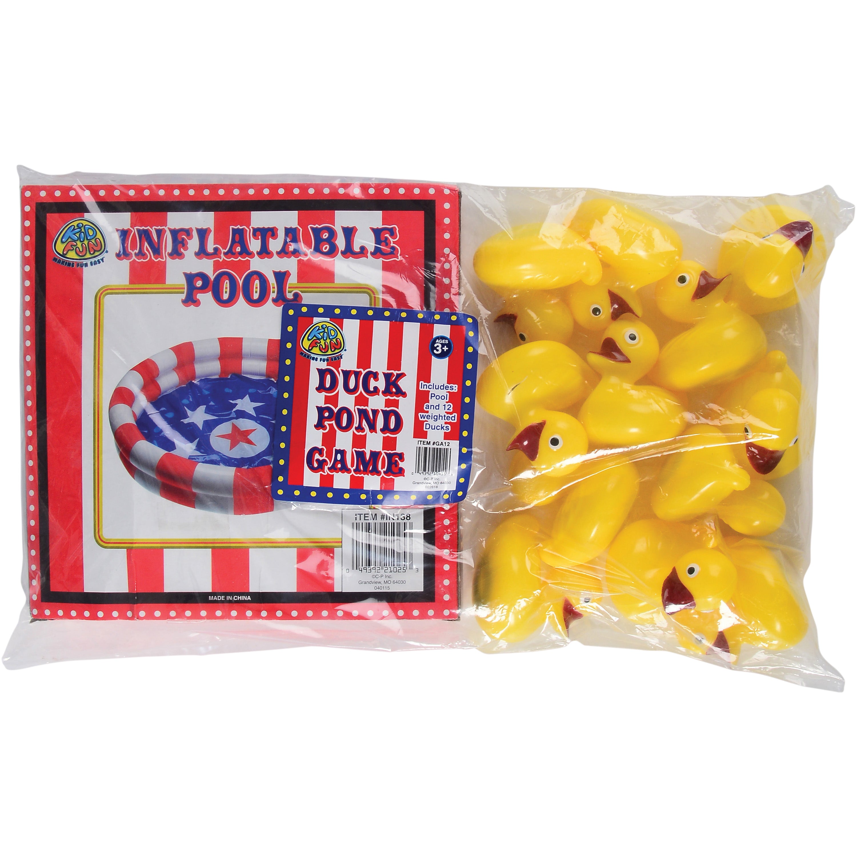 This duck pond game is ready for your school carnival or birthday party game Contestants or party guests choose a duck. The prize corresponds to a number on the bottom of the duck. Includes 1 inflatable pool and 12 ducks per set. Pool size 36" Diameter x 6" Tall when inflated. Ducks are 3"Tall and float upright.