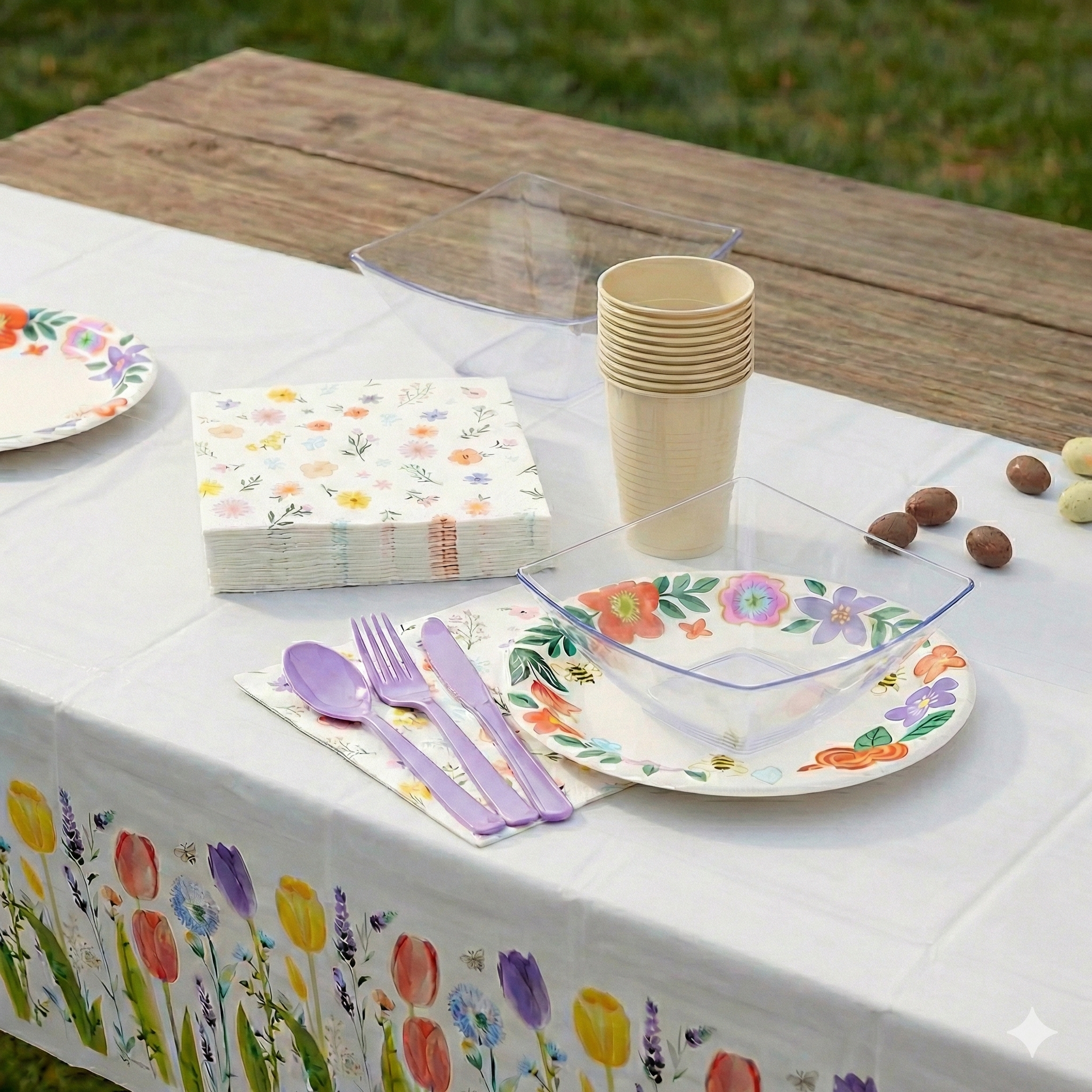 Create an enchanting Easter celebration with this comprehensive floral party kit designed for eight guests. Featuring vibrant spring blooms and coordinated tableware, this all-in-one collection simplifies your party planning while delivering elegant, Instagram-worthy décor. From centerpieces to place settings, every detail captures the festive spirit of the season. Perfect for families, brunches, or intimate gatherings, this kit transforms any space into a blooming Easter paradise without the stress of sourcing individual items. Celebrate spring in style with everything you need in one beautiful package.