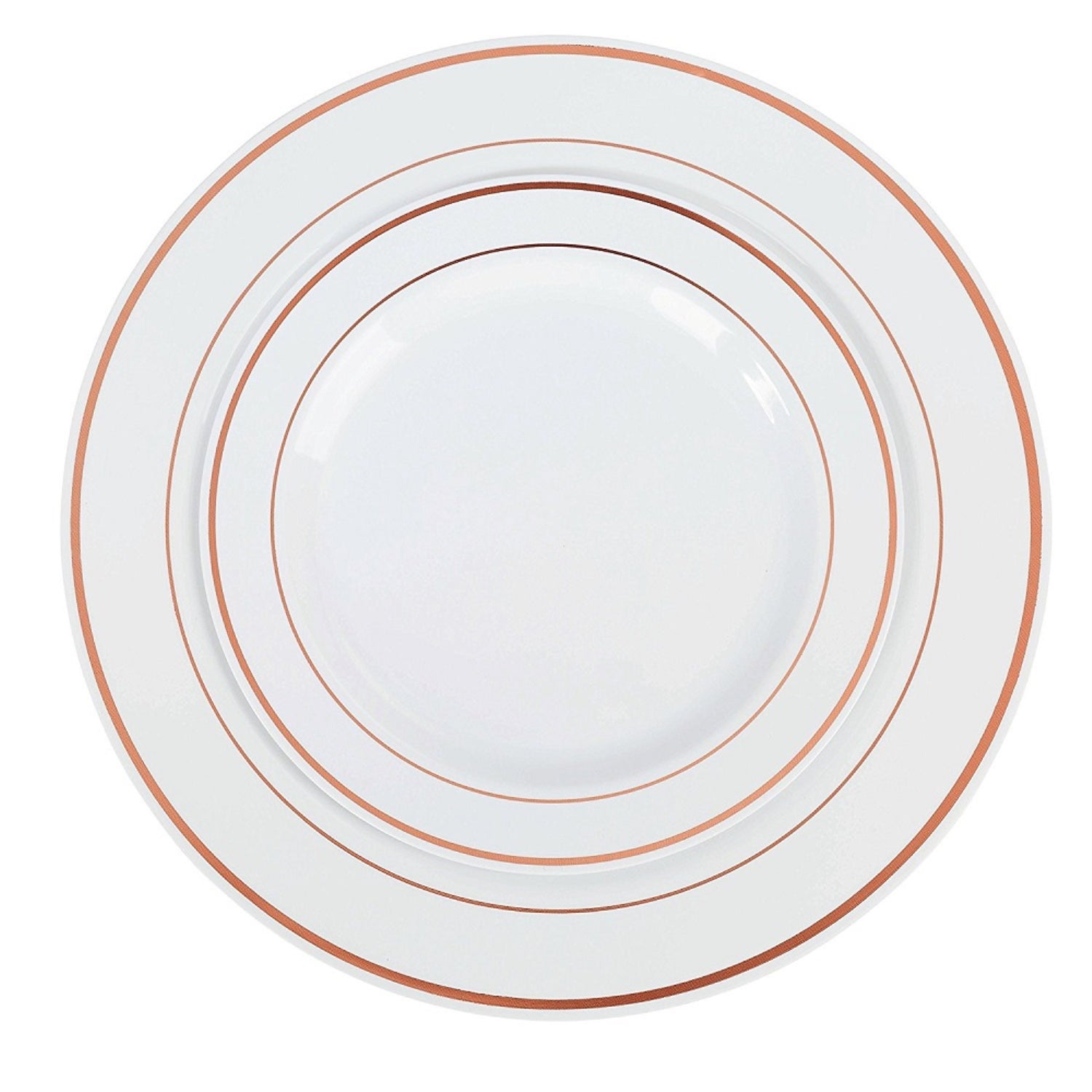 These Fancy Disposable Dinner Plates Feature A White Base With Rose Gold Trimming. Designed To Look Like Real China While Priced So That They Can Be Used As A Disposable, This Elegant Set Is A Must-Have For Any Formal Affair. Each Disposable Dinnerware Set Contains 30 Large (10.25 Inch) Plastic Dinner Plates And 30 Small (7.5 Inch) Plastic Salad/Dessert Plates. Perfect For Weddings, Dinners, Or Any Upscale Party; Our Heavy Duty Plastic Plates Are Also Reusable - Just Clean And Reuse At Your Next Event!