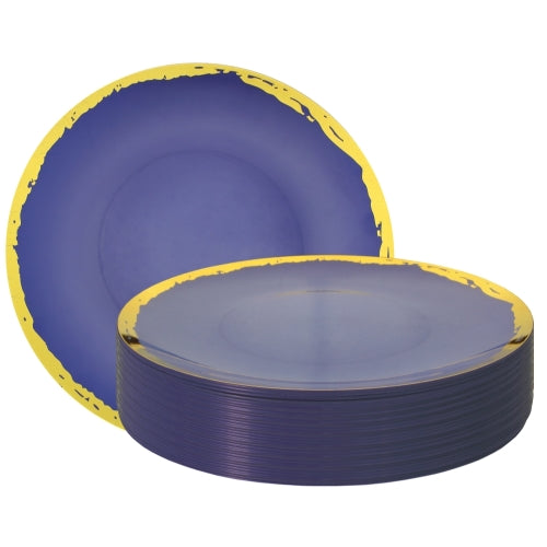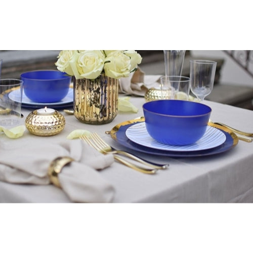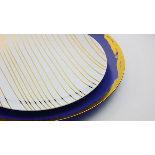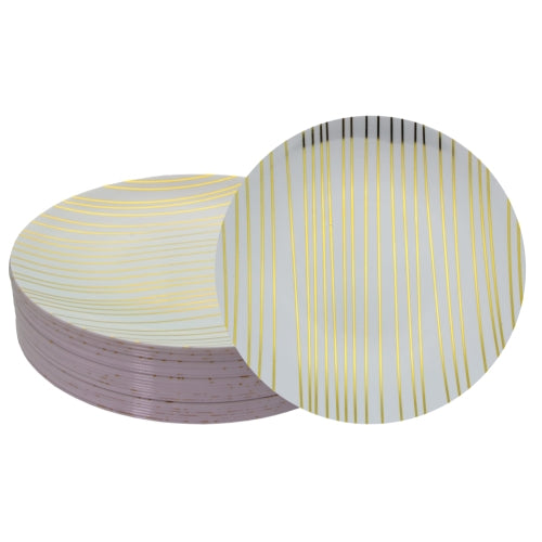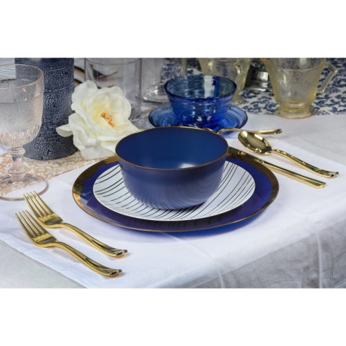 This pack contains 20 counts of 8" and 20 counts of 10" plastic plates. 8" plates feature a diagonal gold line design on a white base. 10" plastic plates feature a blue base with a scratched gold rim. Our elegant plastic plates are crafted to offer both sophistication and convenience, allowing you to create an effortlessly chic table arrangement without the fuss. These plates serve as a stylish complement to your culinary presentations, blending seamlessly with any table decor to enhance the overall dining ambiance. Ideal for those who prioritize both flair and functionality, these plates are the perfect choice for showcasing your impeccable taste.