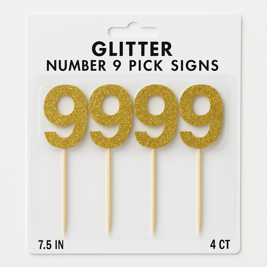 Add a touch of sparkle to your celebrations with these Glitter Gold Number 9 Cake Picks. Perfect for birthdays, anniversaries, or any special occasion, these elegant picks feature a dazzling gold glitter finish. Use them to top cakes, cupcakes, or party snacks, elevating your décor with style. Each pack includes four 7-inch picks, making it easy to create a festive and personalized atmosphere.