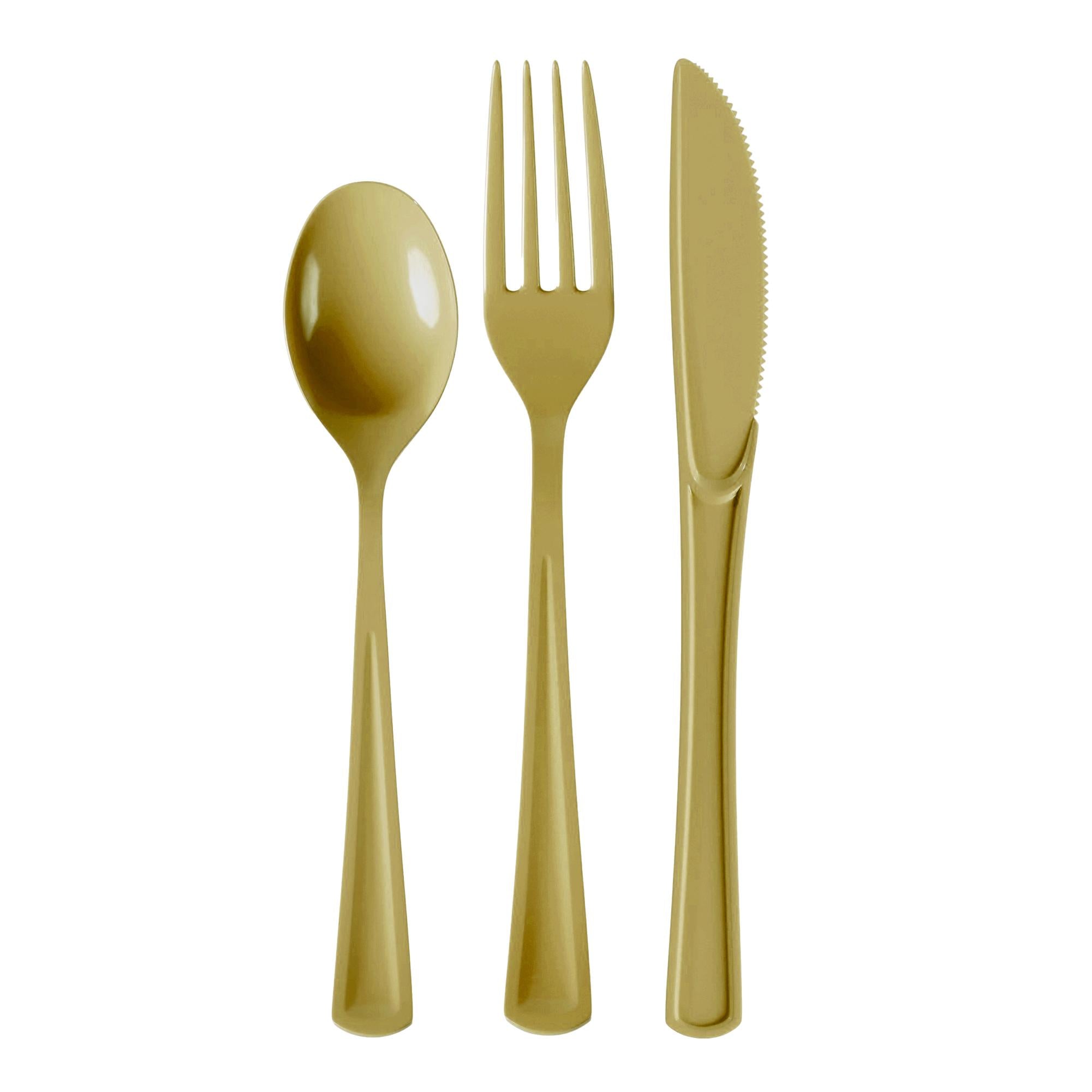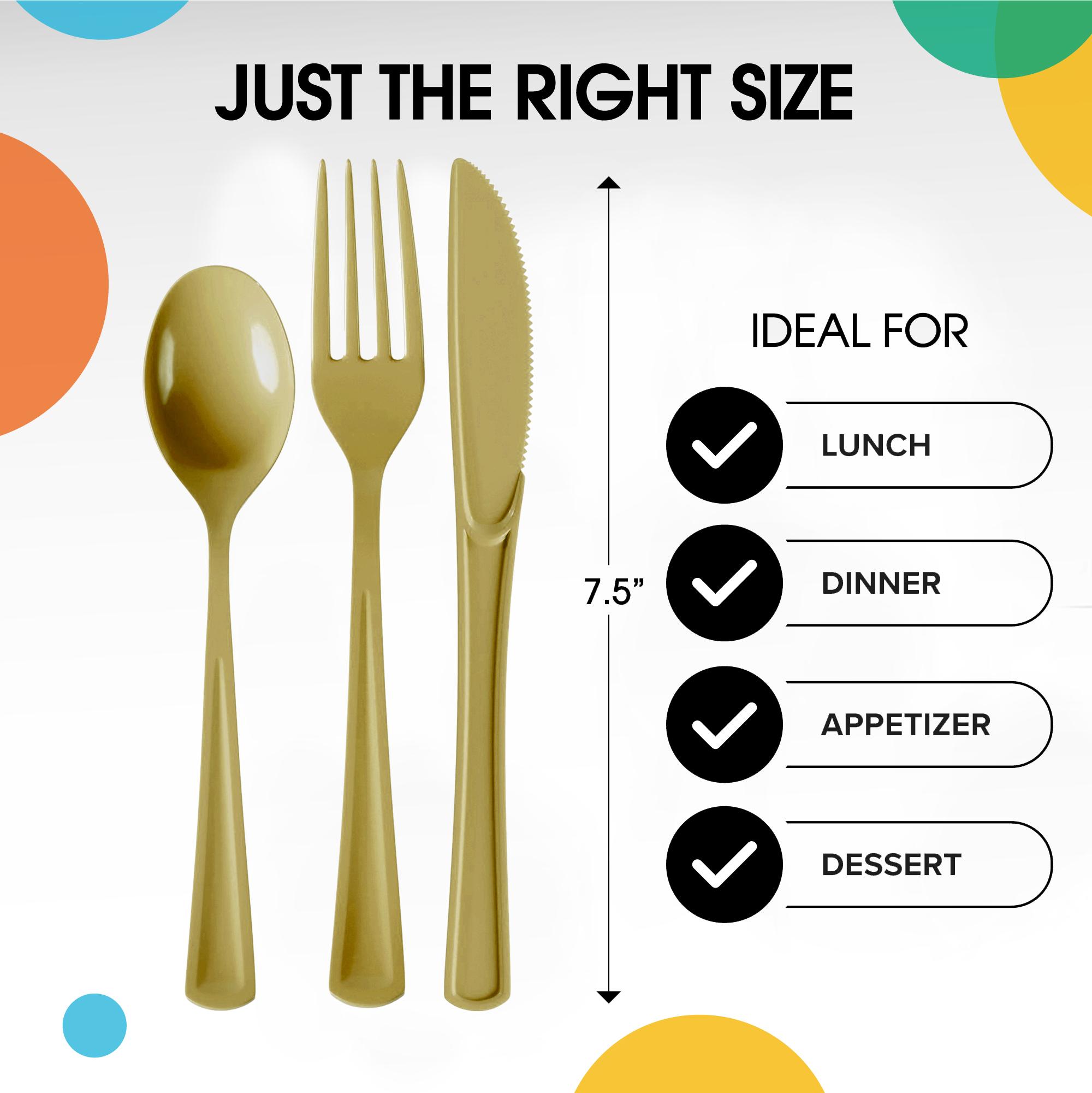 Includes: Each Plastic Silverware Set Contains 50 Forks, 50 Spoons, And 50 Knives, Making It The Ideal Purchase For Your Upcoming Party Needs. A Super Convenient Plastic Cutlery Set With All Your Plastic Silverware In It. Party Pack: Disposable Silverware Is Meant To Be Easy. That Is Why Our Gold Knives, Spoons, And Forks Set Comes Packed The Way It Does. Easy Disposable Cutlery For Your Convenience. Quality: Exquisite Quality Is Not To Be Messed With. Our Heavy-Duty Plastic Forks, Spoons, And Knives Are Made Of Premium Quality Eco-Friendly Plastic That Surely Will Not Disappoint At Your Next Party Or Event Needing Knives, Forks, And Spoons Set.