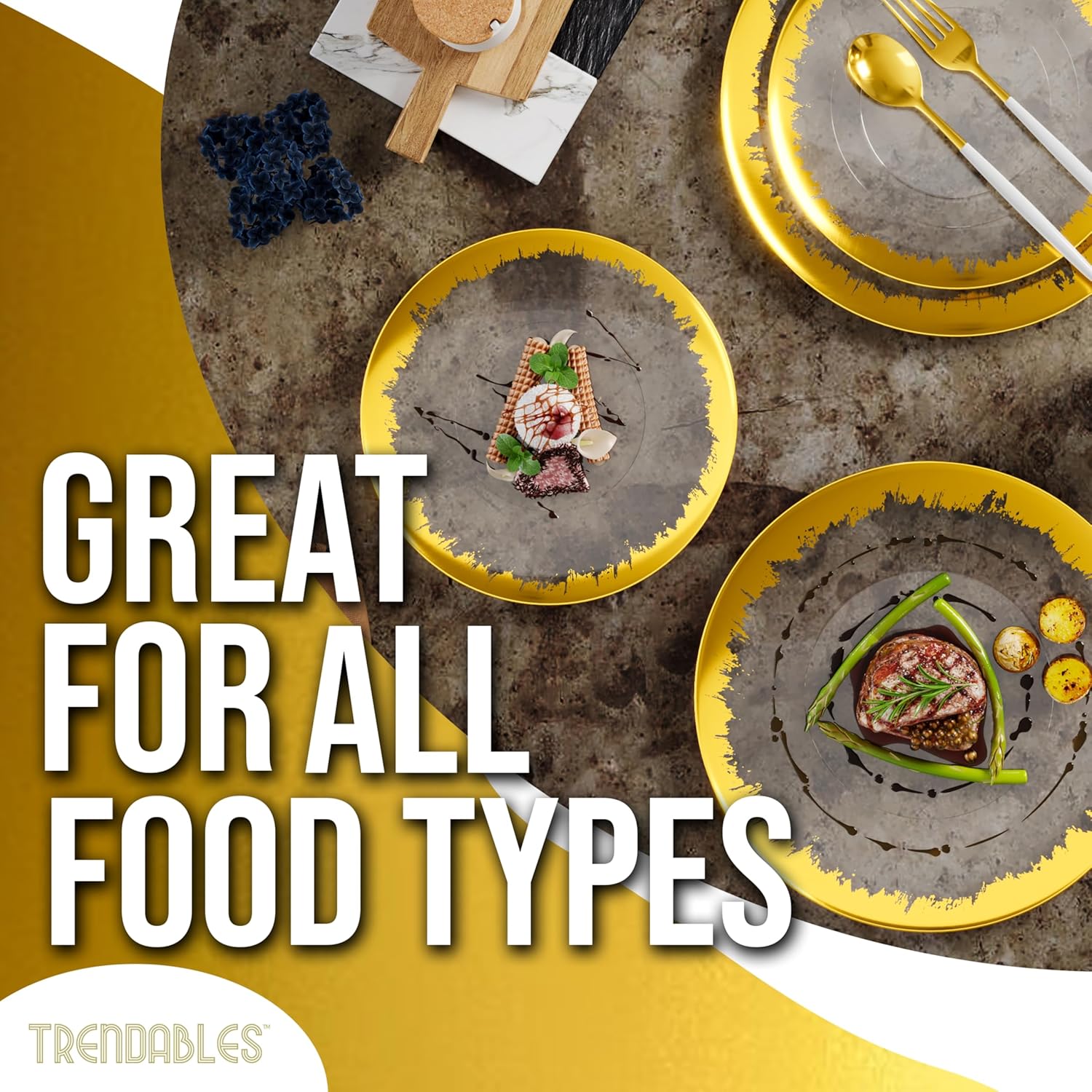 This pack contains 20 clear plastic plates that feature a scratched gold rim design. Our elegant plastic plates are crafted to offer both sophistication and convenience, allowing you to create an effortlessly chic table arrangement without the fuss. These plates serve as a stylish complement to your culinary presentations, blending seamlessly with any table decor to enhance the overall dining ambiance. Ideal for those who prioritize both flair and functionality, these plates are the perfect choice for showcasing your impeccable taste.
