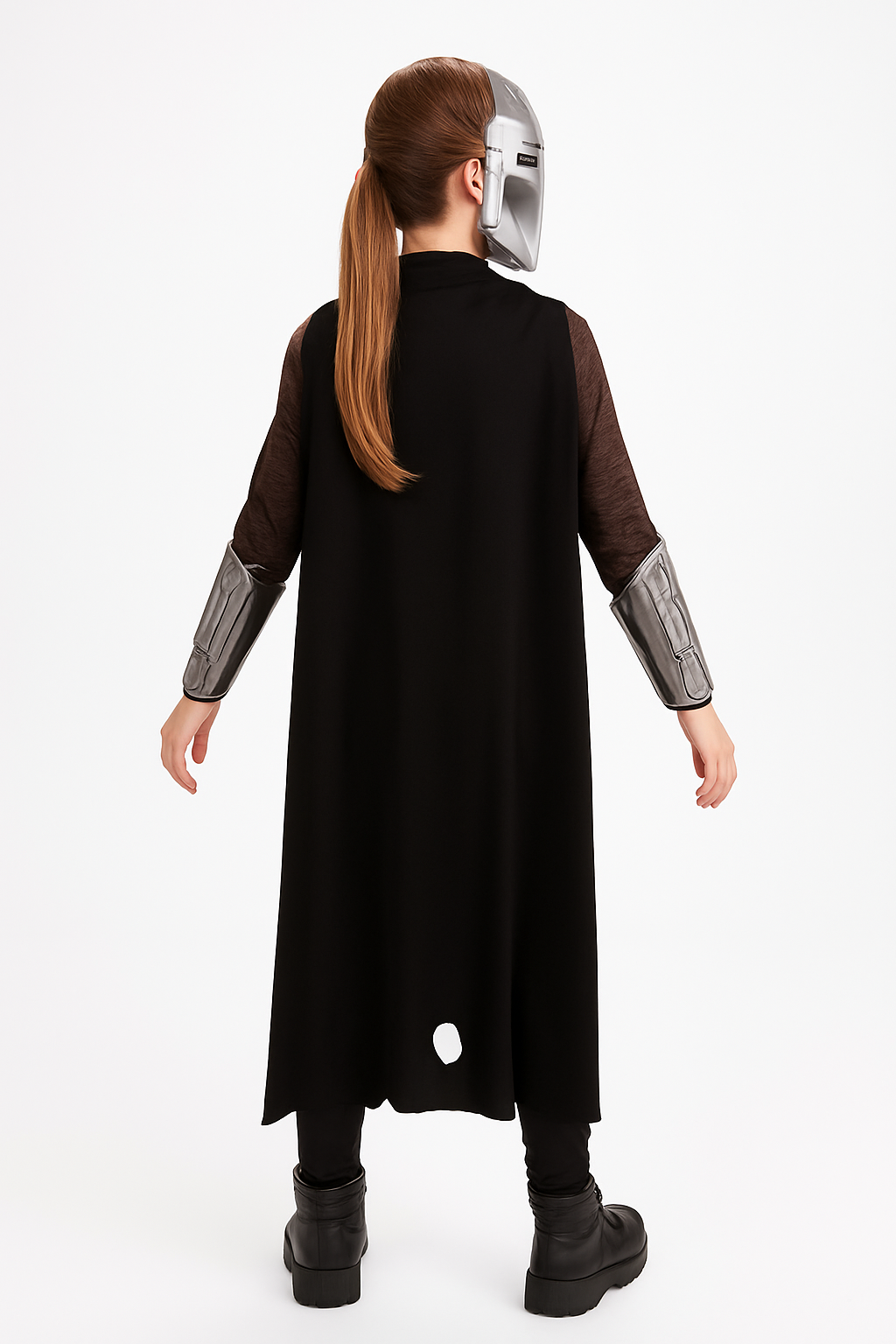 Let your child embark on an intergalactic adventure this Halloween with the Kids' Mandalorian Costume, inspired by the iconic Star Wars series. This deluxe ensemble features a padded muscle jumpsuit, complete with an attached belt and detachable black cape for that authentic space warrior look. It includes a plastic helmet mask and a chest strap with faux ammo cartridges that attach diagonally across the chest, all securing with convenient hook-and-loop closures. Available in assorted sizes, this costume ensures your little hero is ready to help Baby Yoda find his Jedi home. Perfect for fans of the beloved series!