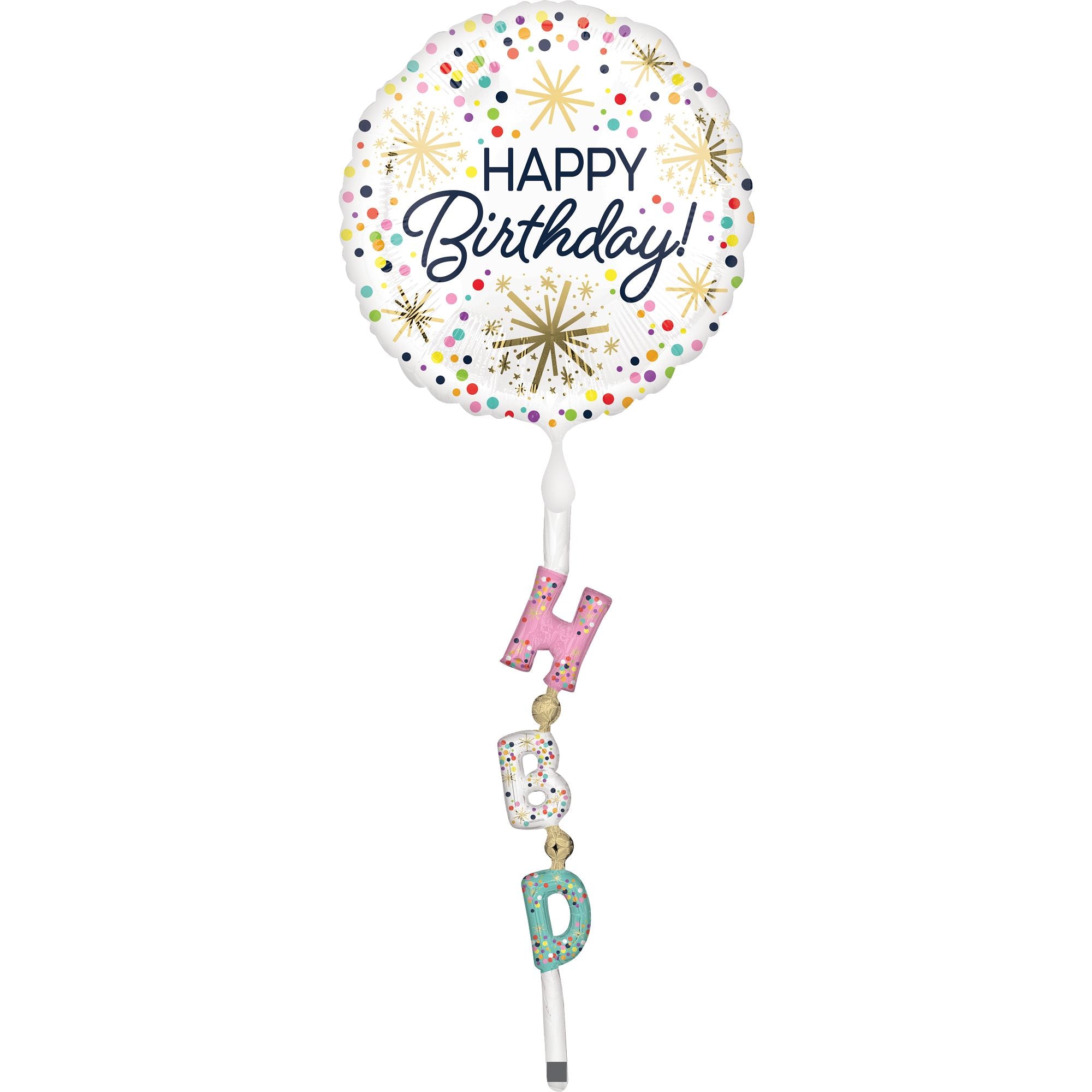 Bring extra joy to any birthday celebration with this Metallic Happy Birthday Sprinkles Foil Air Walker Balloon. Featuring a vibrant design with colorful polka dots and festive starburst patterns, this balloon sets the perfect party atmosphere. Attached are fun, metallic "HBD" letters that add a playful touch. Ideal for birthdays all year round, this air walker balloon is sure to be a delightful centerpiece at any party.