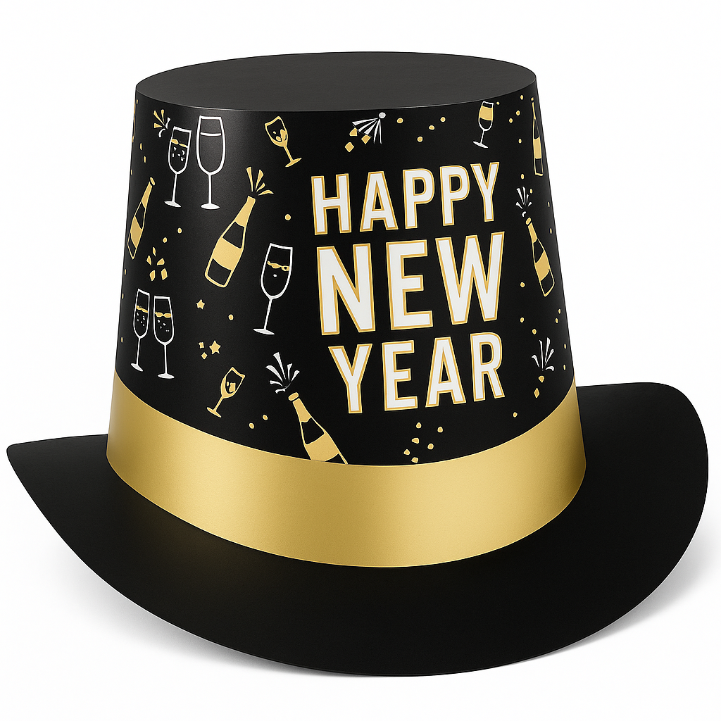 Ring in the New Year with style and flair wearing this Festive New Year's Eve Celebration Top Hat. Featuring a sleek black, silver, and gold design adorned with festive champagne bottle and glass graphics, this hat is perfect for any party. The bold "Happy New Year" message makes it an eye-catching accessory. Designed to fit all sizes, it's an essential addition to your New Year's Eve wardrobe. Celebrate with panache and make unforgettable memories!
