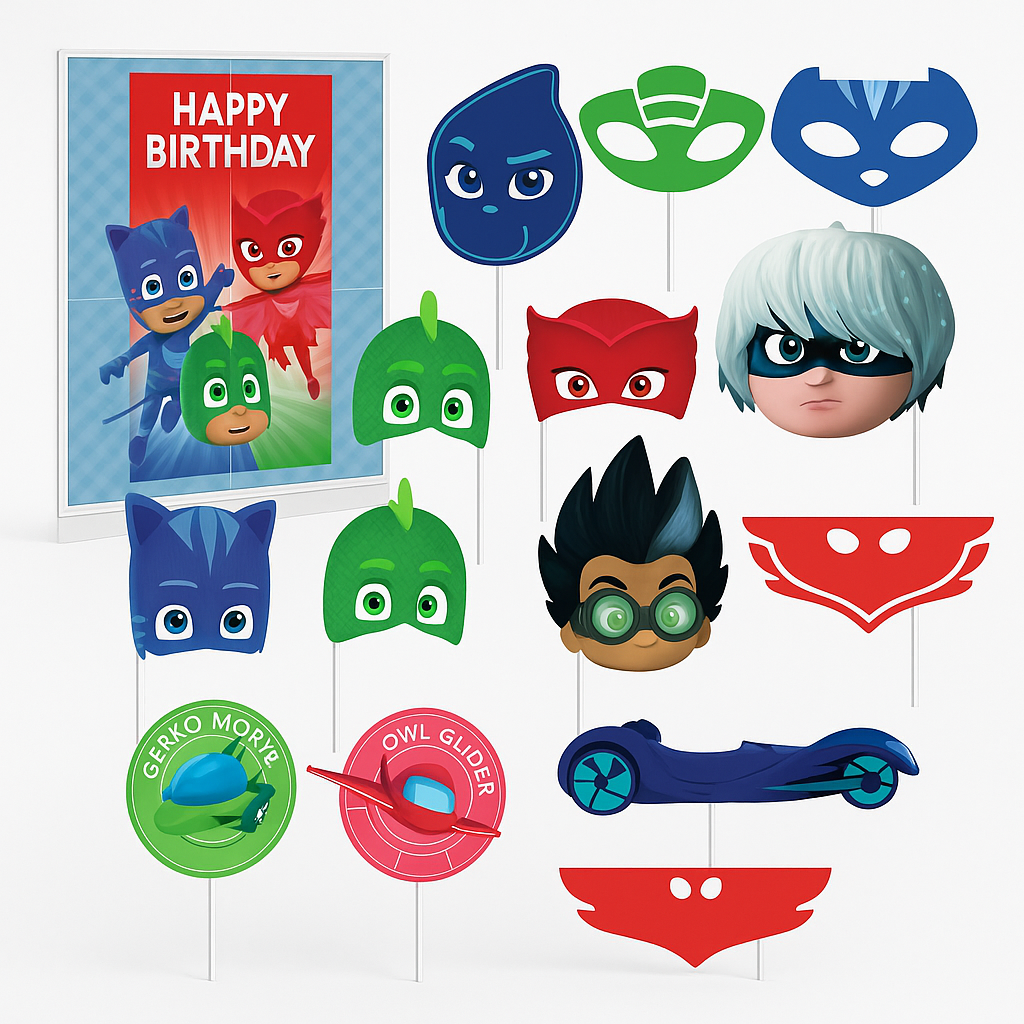 Transform your child's birthday party into a heroic adventure with the PJ Masks Scene Setter Kit! This colorful decoration includes a four-piece backdrop featuring Catboy, Owlette, and Gekko under a vibrant "Happy Birthday" banner. Perfect for photo ops, it also comes with a variety of cardstock props, allowing kids to pose as their favorite masked heroes or playful villains. Ideal for creating unforgettable memories, this set is a must-have for any PJ Masks-themed celebration.
