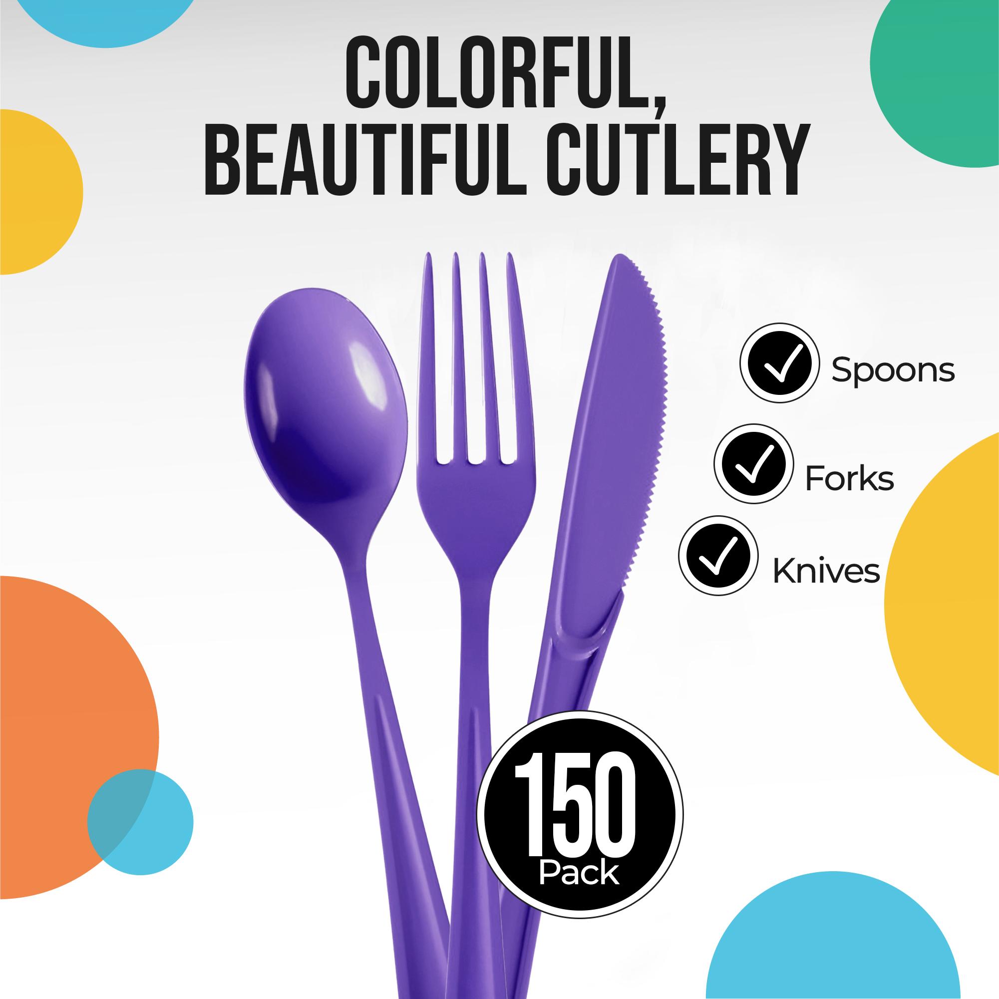 Includes: Each Plastic Silverware Set Contains 50 Forks, 50 Spoons, And 50 Knives, Making It The Ideal Purchase For Your Upcoming Party Needs. A Super Convenient Plastic Cutlery Set With All Your Plastic Silverware In It. Party Pack: Disposable Silverware Is Meant To Be Easy. That Is Why Our Purple Knives, Spoons, And Forks Set Comes Packed The Way It Does. Easy Disposable Cutlery For Your Convenience. Quality: Exquisite Quality Is Not To Be Messed With. Our Heavy-Duty Plastic Forks, Spoons, And Knives Are Made Of Premium Quality Eco-Friendly Plastic That Surely Will Not Disappoint At Your Next Party Or Event Needing Knives, Forks, And Spoons Set.