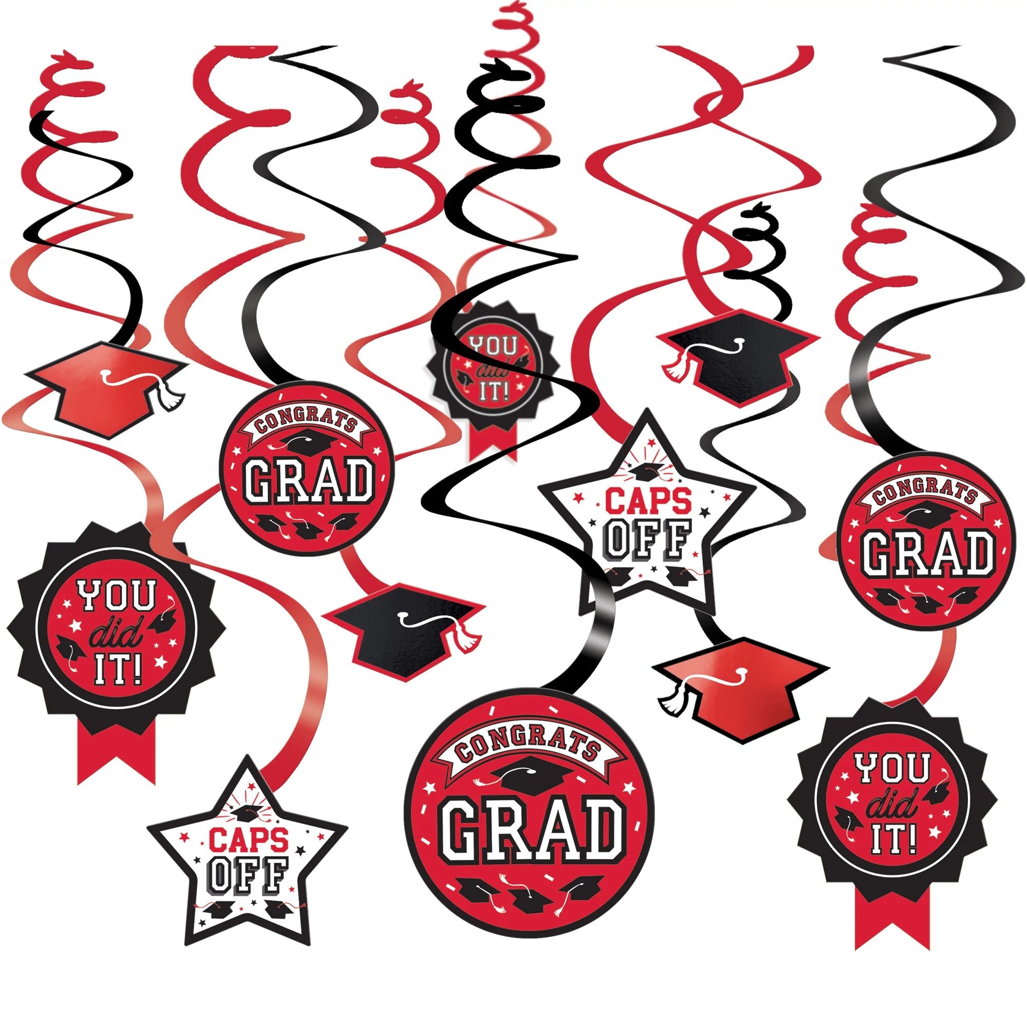 Celebrate your graduate's big day with these vibrant Red Graduation Swirl Decorations. This value pack includes shiny spiral swirls with festive paper cut-outs that read "Congrats Grad," "Caps Off," and "You Did It!" Perfect for adding a splash of color and excitement to any graduation party. Easy to hang and sure to impress, these decorations are an essential addition to your celebration.