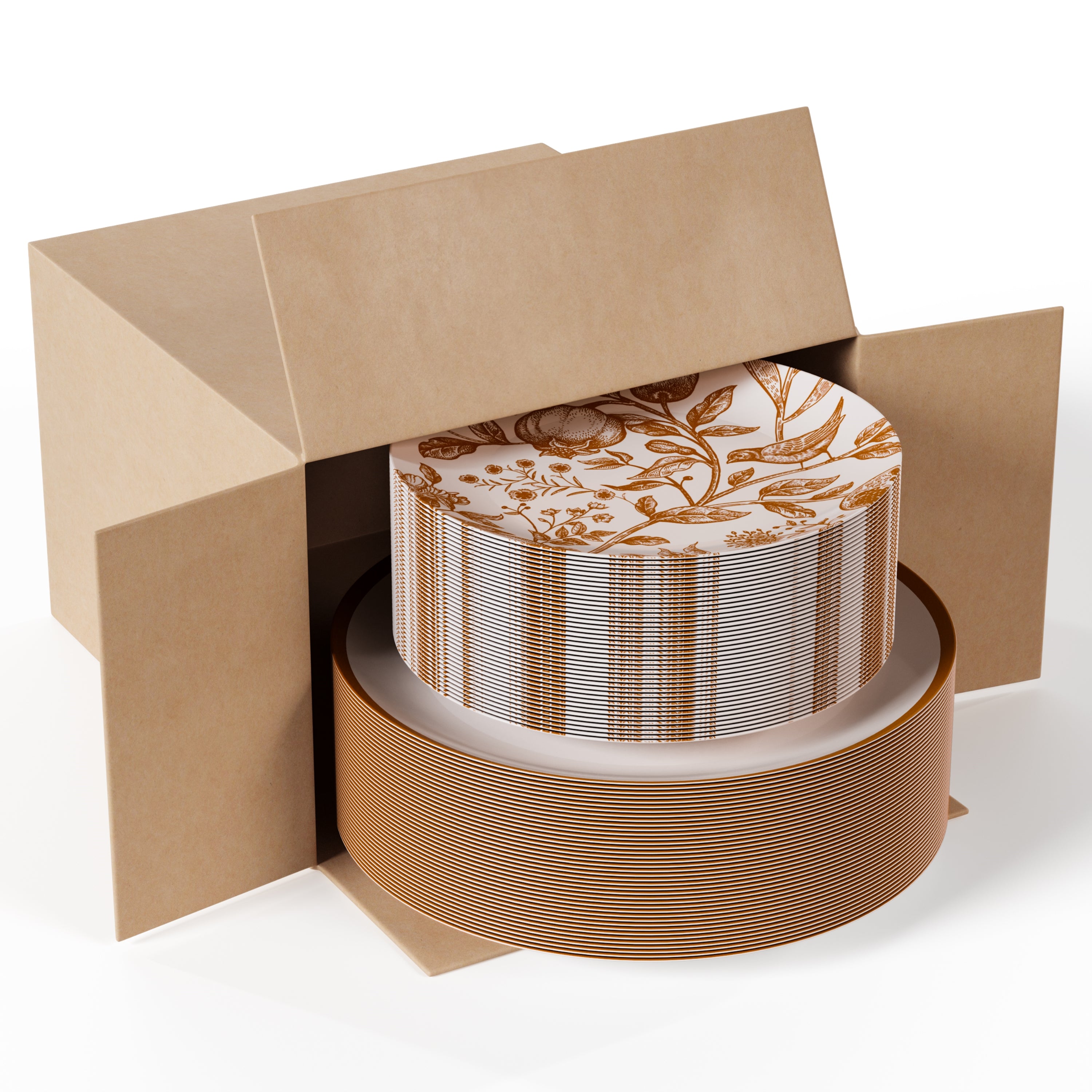 This pack contains 20 counts of 8" and 20 counts of 10" brown and white plastic plates. Our 8" plates feature a white base hot stamped with brown floral motifs. Our 10" plates feature a white base with a brown rim. Our elegant plastic plates are crafted to offer both sophistication and convenience, allowing you to create an effortlessly chic table arrangement without the fuss. These plates serve as a stylish complement to your culinary presentations, blending seamlessly with any table decor to enhance the overall dining ambiance. Ideal for those who prioritize both flair and functionality, these plates are the perfect choice for showcasing your impeccable taste.
