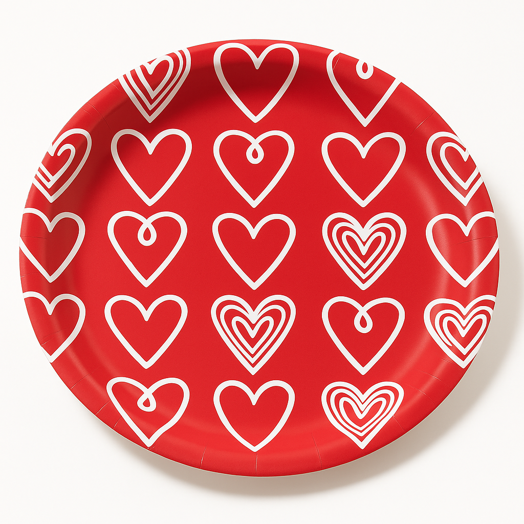 Celebrate love with our 6.75" Romantic Red Heart Paper Plates, perfect for any Valentine's Day gathering. Featuring a charming white heart design on a vibrant red backdrop, these plates add a touch of romance to your table setting. Ideal for serving appetizers and desserts, these disposable plates make party cleanup a breeze. Elevate your Valentine's Day celebration with this delightful printed ensemble!