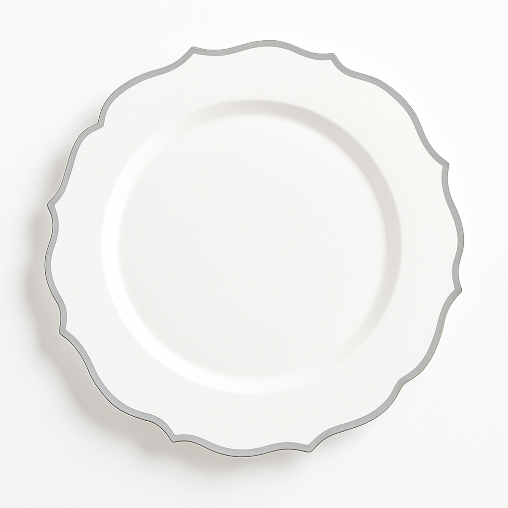 Elevate your dining experience with our Elegant 10.5" Premium Plastic Dinner Plates. Each white plate is adorned with a sophisticated silver trim, perfect for adding a touch of class to any occasion. Made from sturdy, premium plastic, these plates are ideal for serving generous portions of your favorite meals. With 20 plates per package, they're perfect for parties, weddings, or everyday use. Please note, these plates are not microwave safe. Make every gathering special with this exquisite dinnerware.