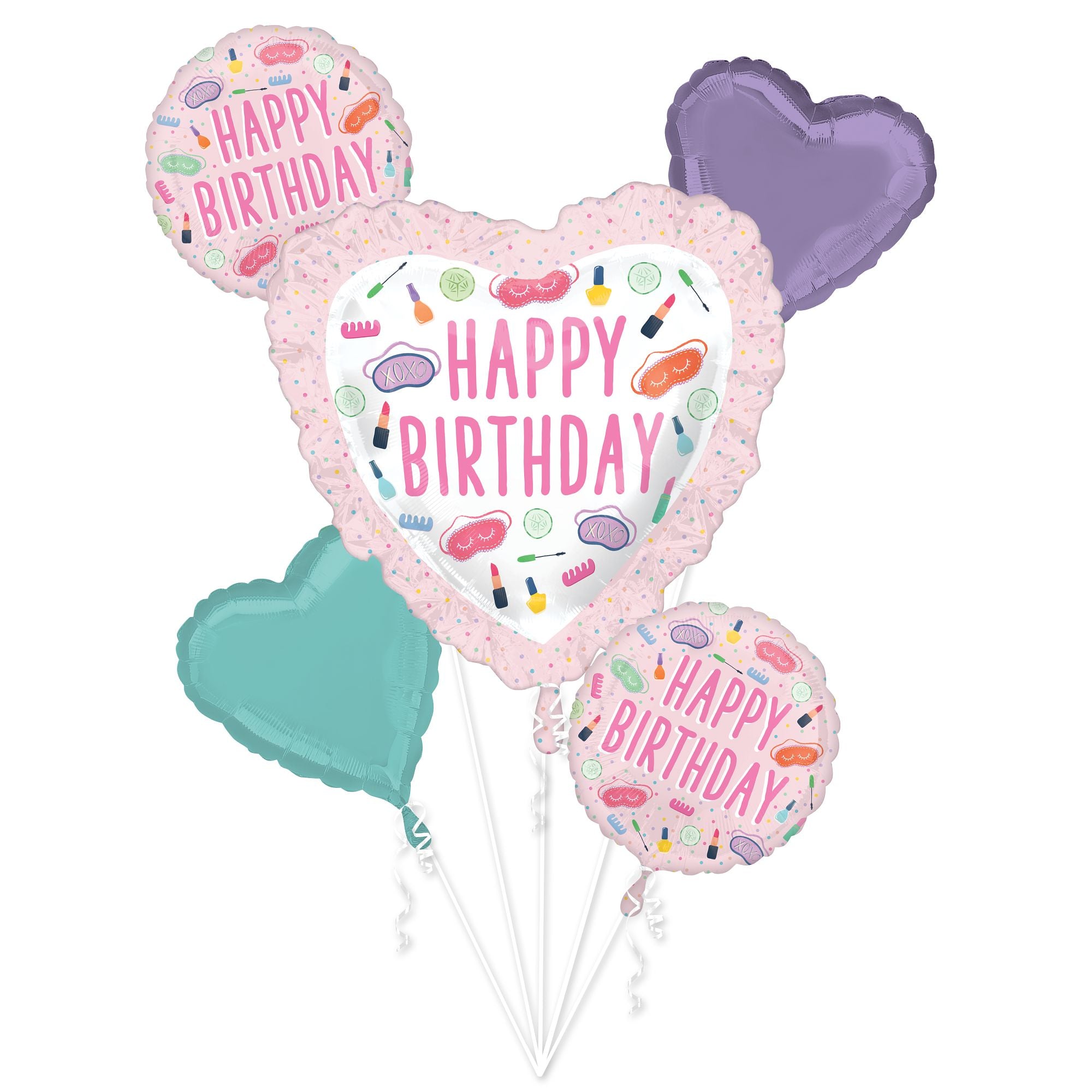 Elevate your birthday celebrations with our Spa-Themed Birthday Foil Balloon Bouquet. This charming set includes a heart-shaped "Happy Birthday" balloon surrounded by delightful spa-themed illustrations, complemented by coordinating purple and teal heart balloons. Perfect for a stylish and relaxing birthday ambiance, this metallic balloon bouquet is a fabulous addition to any party decor. Ideal for a memorable and fun-filled celebration!