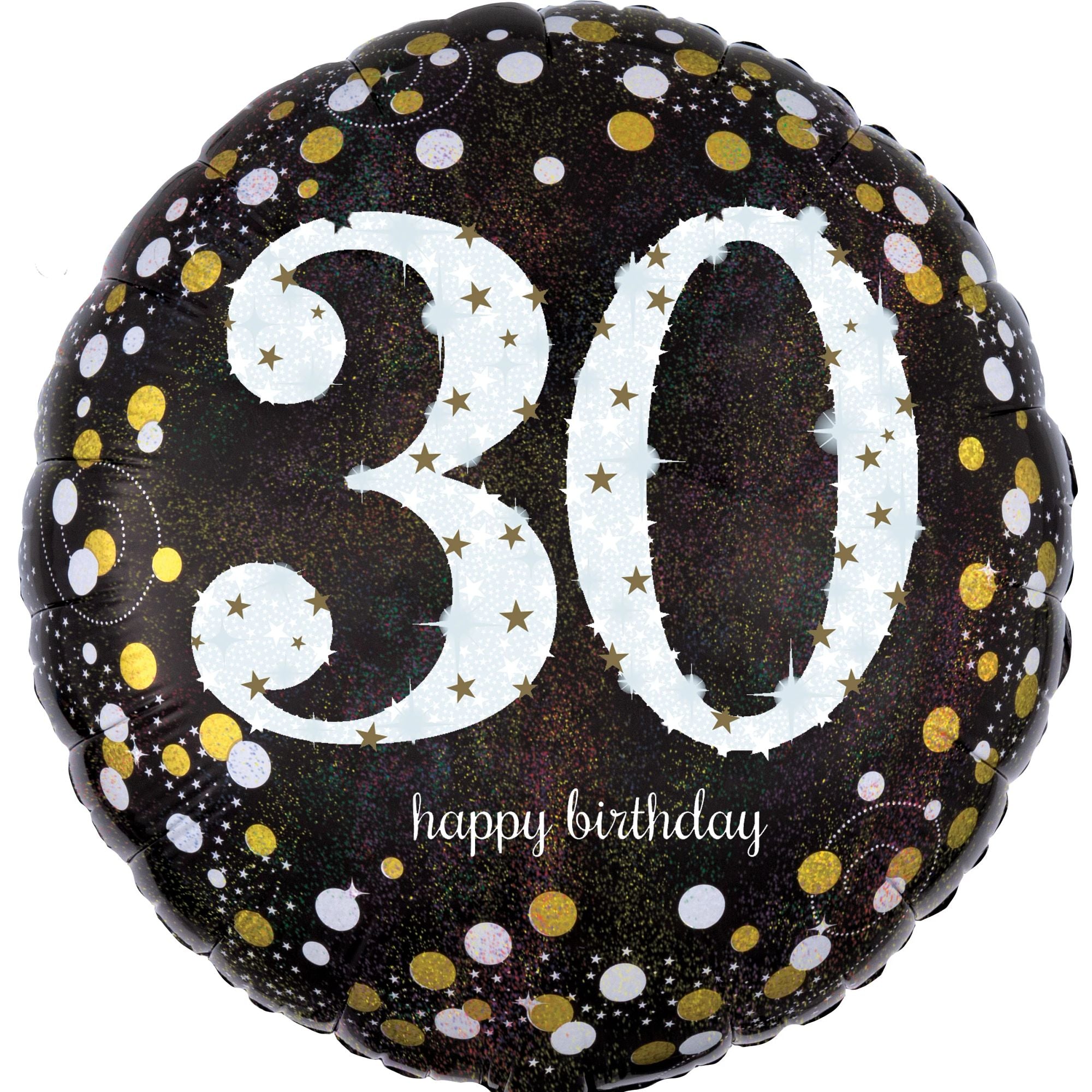 Celebrate this milestone year in style with our 18-inch Sparkling 30th Birthday Foil Balloon. Perfect for adult birthday parties, this dazzling balloon features a shimmering design with gold and white accents, ready to add a touch of elegance to any celebration. Durable and eye-catching, it's an ideal choice for marking this special occasion with flair. Inflate with helium for a floating festivity centerpiece or add to a balloon bouquet for a stunning display.