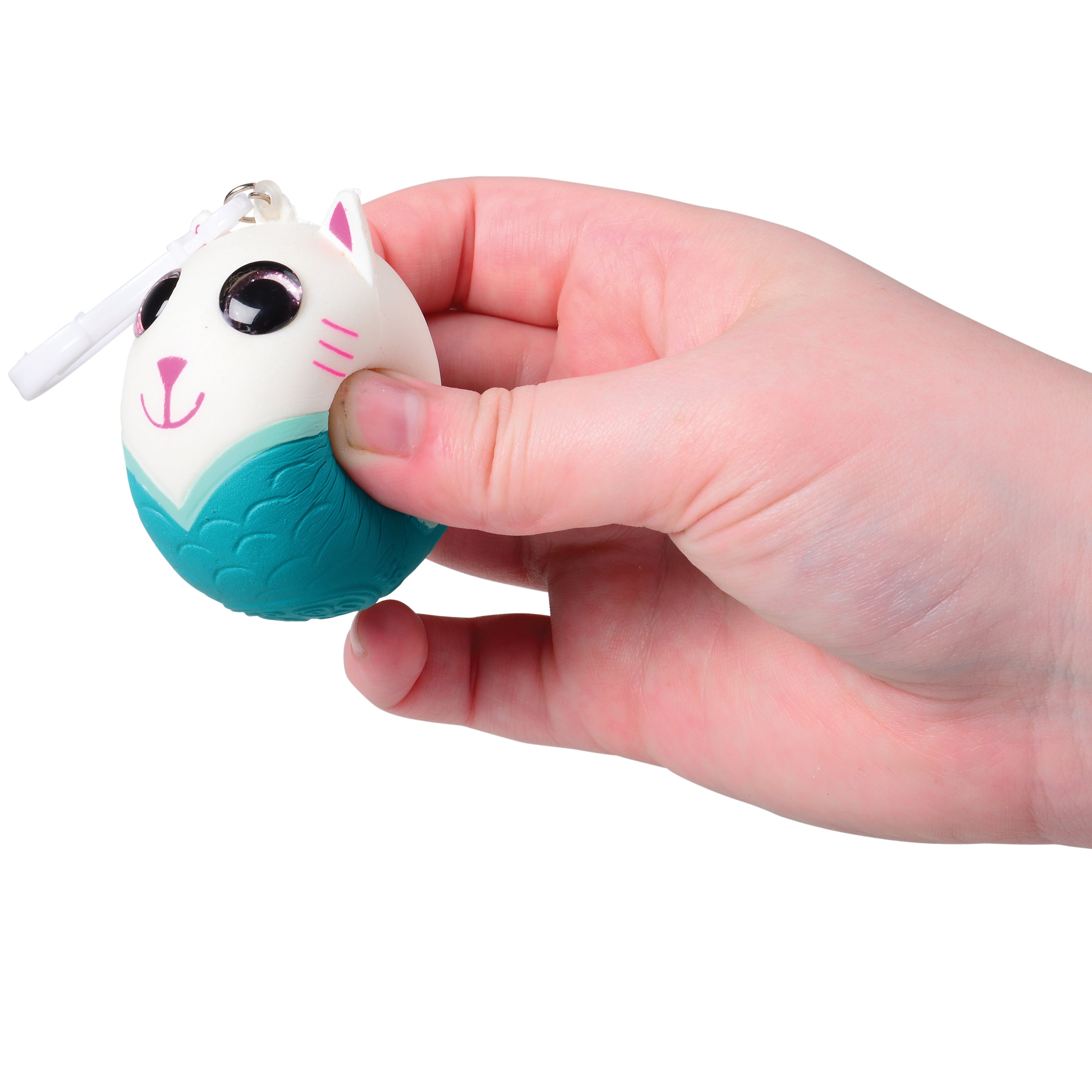 Add fun to any party favor bag or classroom reward with these squishy purrmaids Their bright glittering eyes give new life to these fun slow rise squishy toys. The plastic clip make these a great backpack clip collectible any mercat fan will enjoy.