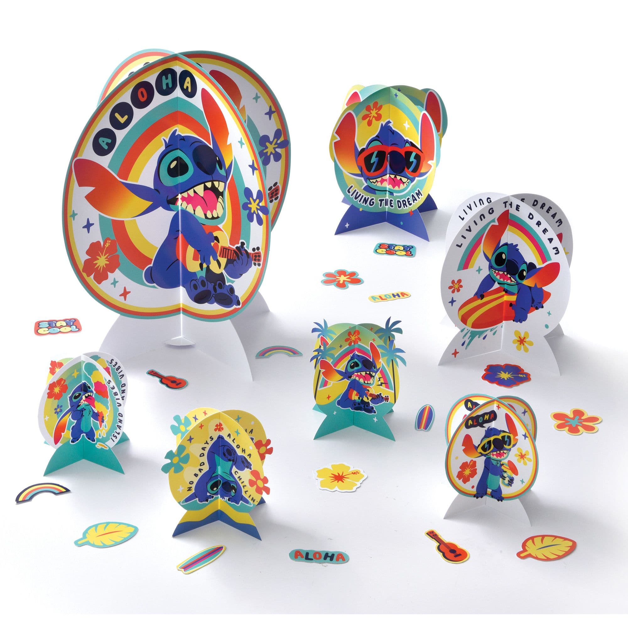 Bring the fun and excitement of Stitch to your child's birthday celebration with this delightful Stitch Table Centerpiece Kit. Perfect for any Stitch-themed event, this kit includes 7 charming paper centerpieces (1 large, 2 medium, 4 small) and 24 confetti cutouts, creating a vibrant and festive atmosphere. With centerpiece heights ranging from 12.5" to 4.3" and cutout sizes of 2", this kit is ideal for capturing the spirit of Aloha and adventure. Transform your party table into a captivating display with this out-of-this-world decoration set!