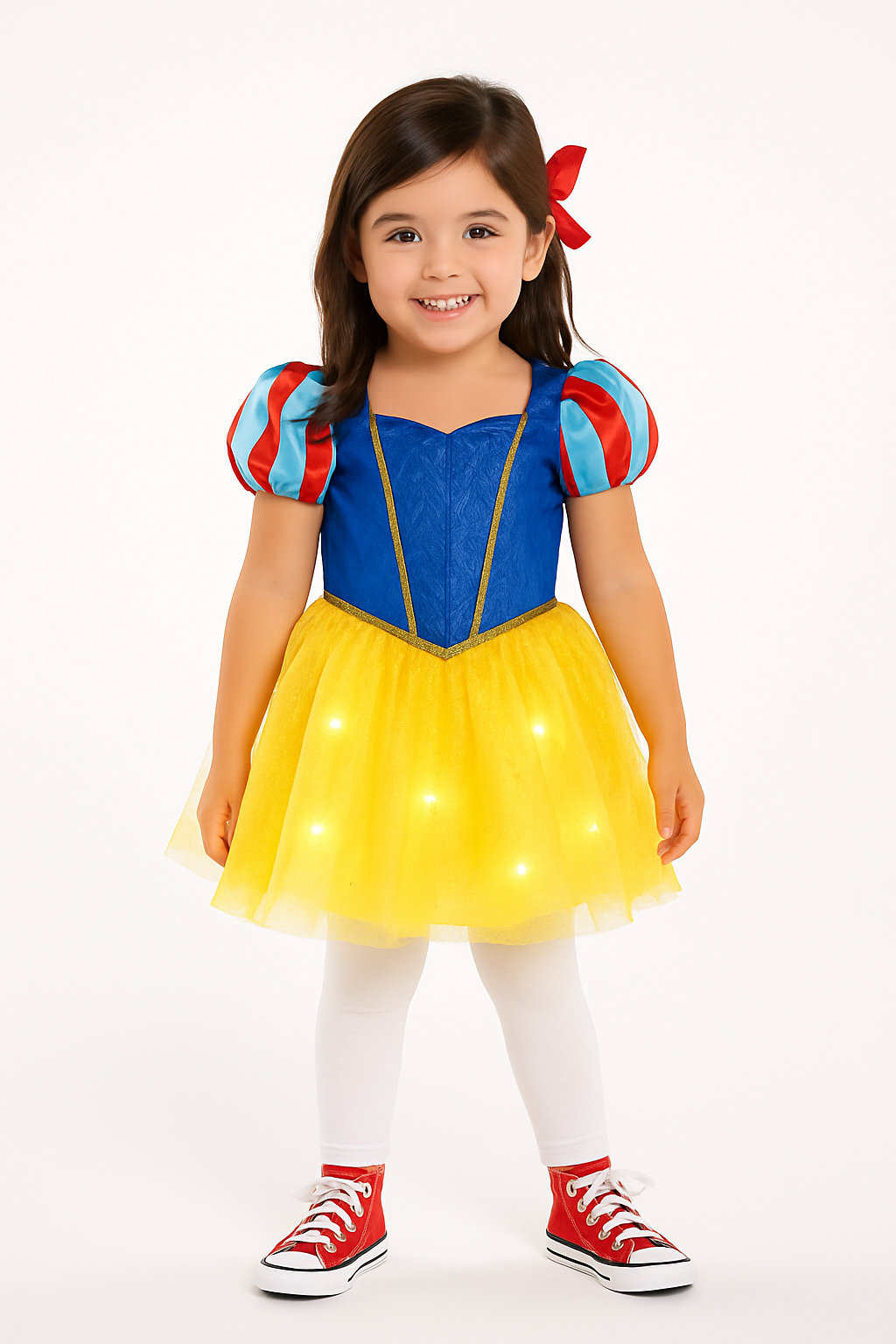 Transform your child into the enchanting Snow White with this dazzling Light-Up Costume! Perfect for Halloween or dress-up fun, this elegant blue and gold dress features glittery mesh layers and twinkling lights, making your little one the center of attention. Ideal for young princesses, it pairs beautifully with blue shoes for a complete fairytale look. Available in sizes Small to Extra Large, bring some magic to their wardrobe with this stunning Snow White costume!
