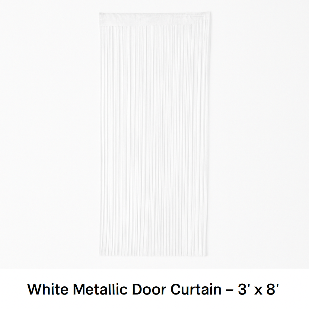 Elevate your event decor with this stunning White Metallic Door Curtain. Measuring 3 feet by 8 feet, it's the perfect addition to any celebration. Ideal for both everyday gatherings and special occasions, this shimmering curtain adds a touch of elegance and style. Whether used as a backdrop or a doorway accent, its versatile design enhances any setting with a chic, modern look. Easy to hang and dazzling in appearance, this metallic curtain is sure to impress your guests.
