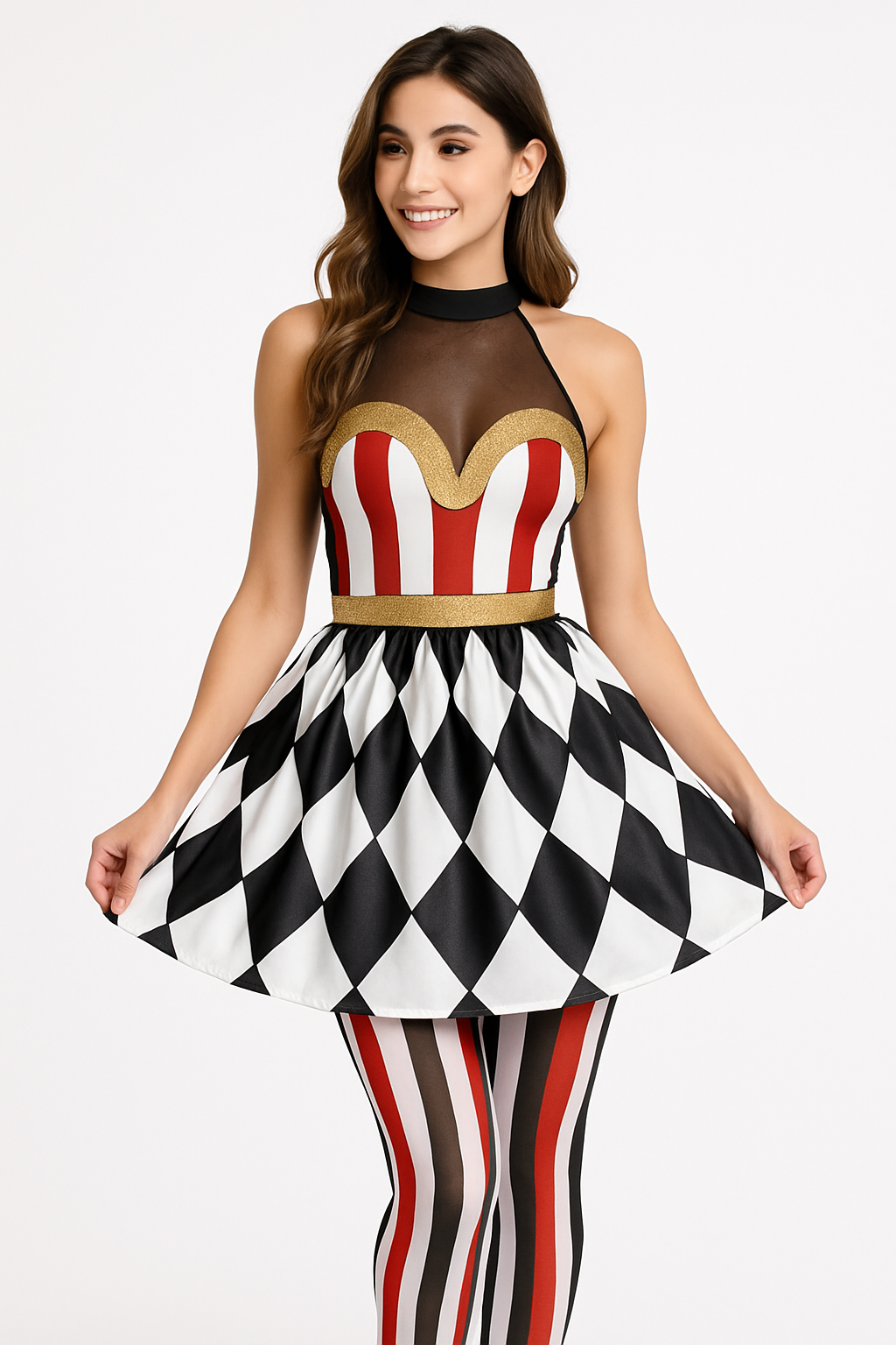 Step right up and dazzle this Halloween with our Women's Vintage Circus Skirt. Featuring an eye-catching black and off-white diamond pattern, this skirt is accented with a glitter band for a touch of sparkle. The back zipper ensures a comfortable fit, while the tulle overlay adds whimsical flair. Perfect for a standout Halloween look, this skirt is available in sizes S/M and L/XL. Complete your circus-themed costume with this enchanting accessory!