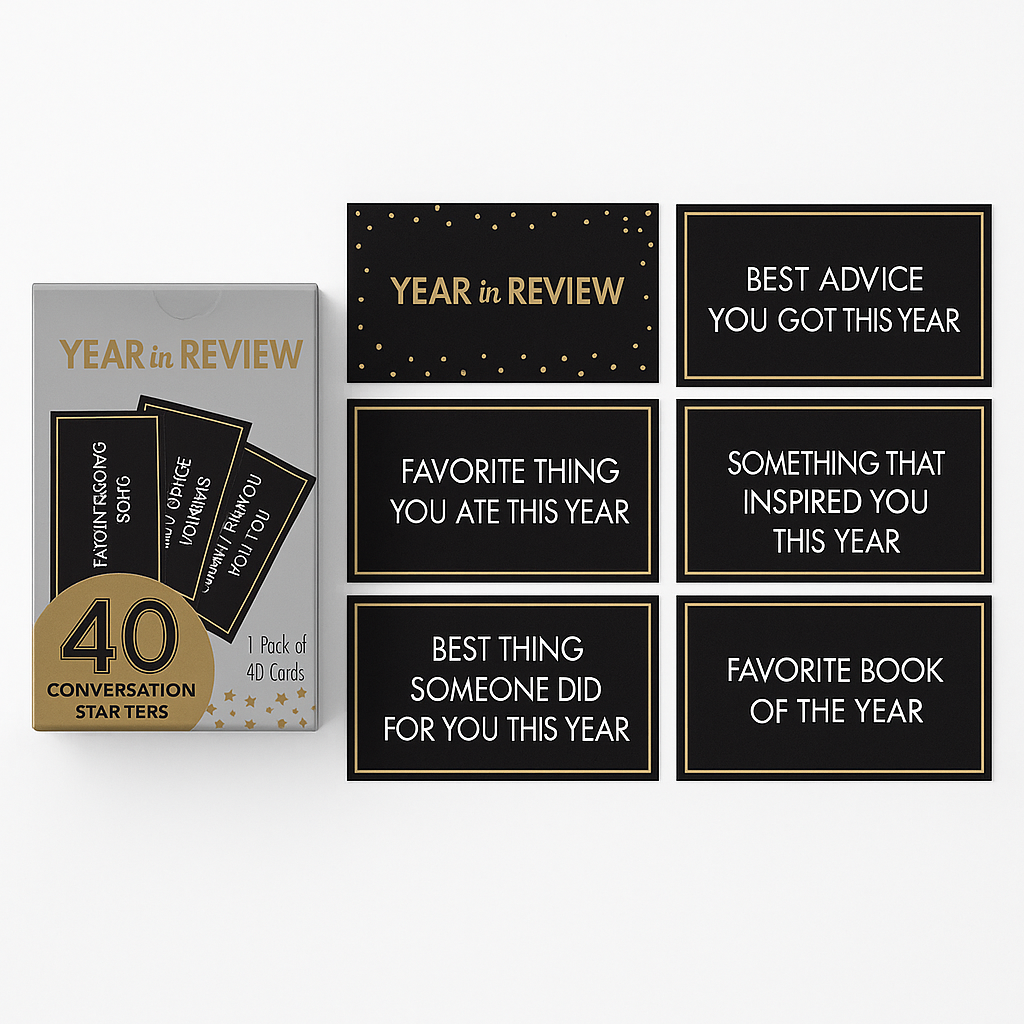 Celebrate New Year's Eve with the "Year in Review" Card Deck! Featuring 40 thoughtfully crafted cards, this set is perfect for sparking engaging conversations at your party. Each card poses intriguing questions like "What was your favorite thing you ate this year?" and "What's the best advice you received?" Use these cards as a fun party game or to inspire New Year's resolutions. Measuring 3" x 5" and crafted from high-quality paper, they’re a delightful way to reminisce and share memorable moments with friends and loved ones. Make your celebration unforgettable with this must-have party accessory!